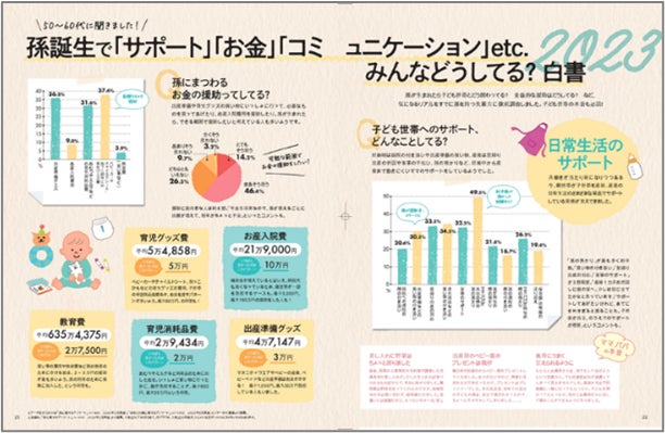 こうした状況の中、祖父母世代の時代とともに変化する子育ての「常識」を知りたいというニーズの高まりを受け、「チーム育児」を応援する新メディア、祖父母向け情報マガジン『孫ができたら最初に読む本』の特別刊行を決定いたしました。今どきの妊娠・出産・育児に関する情報や、50~60代世代に聞いた孫育児事情、今夏「おば休(おばあちゃん休暇)」としてカナダで長男夫妻の出産・育児をサポートした北斗晶さん&佐々木健介さん夫妻のインタビューなど、3世代育児に役立つ一冊です。2023年9月14日から応募受付を開始し、抽選で5万名様に無料プレゼント、12月より指定先へ直接お届けします。