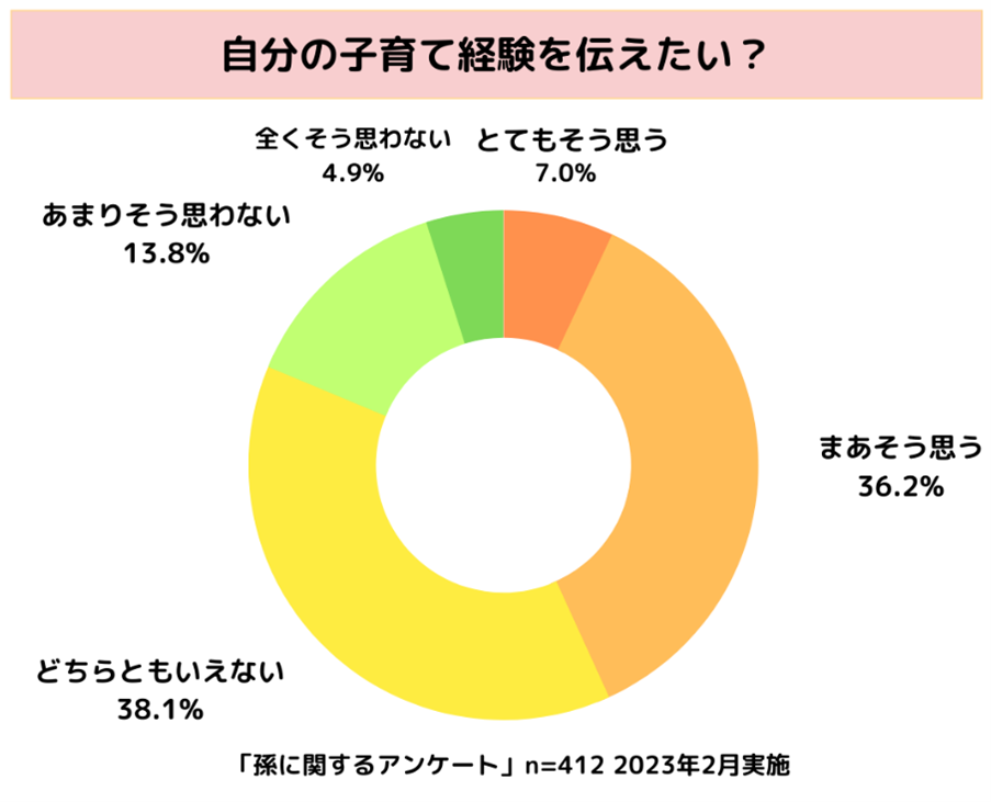 自分の子育て経験を伝えたいと思うか?という質問に対し、「とても+まあそう思う」と回答された方は約4割。過半数の方は、自分たち世代の子育て環境との違いなどを感じ、「どちらともいえない」「あまり+全くそう思わない」と答えられています。