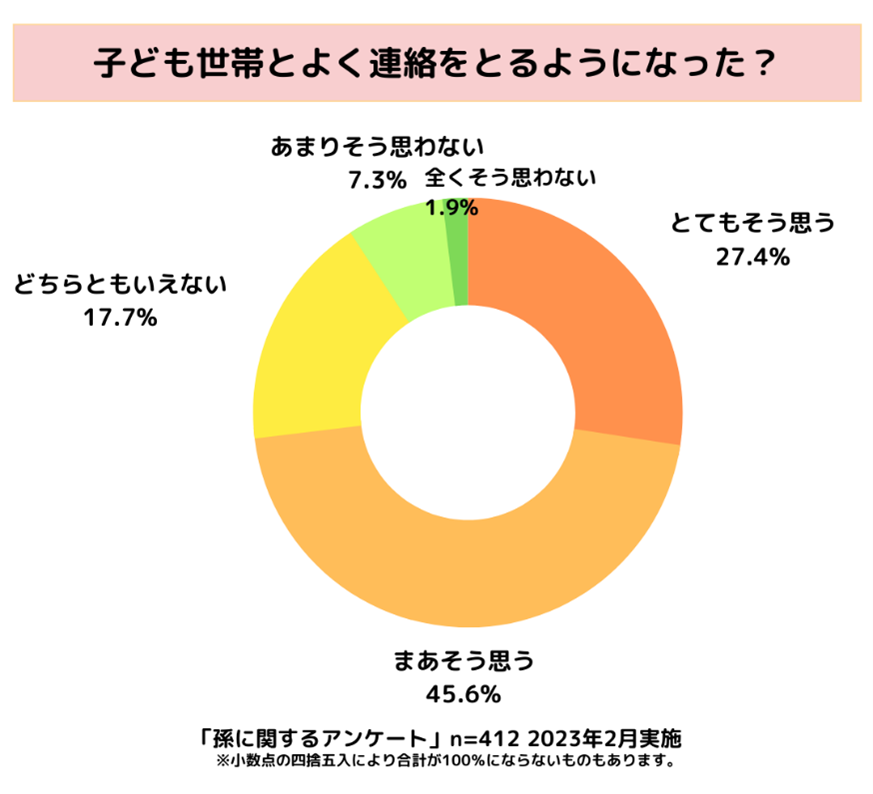 孫誕生後、子ども世帯とよく連絡をとるようになったかという質問に、「とても+まあそう思う」と答えた方は約7割。スマホやタブレットなどの普及もあり、孫の成長の様子を動画や写真で送るなど、子ども世帯からの連絡が増える傾向にあるようです。