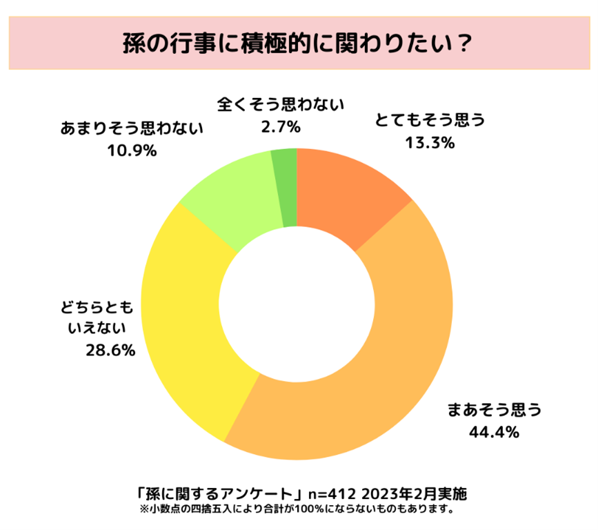 孫の行事に積極的に関わりたいかという質問に対し、約6割の方が「とても+まあ思う」と回答されました。