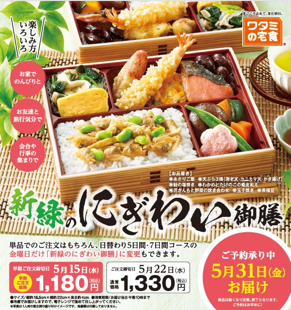 ワタミ株式会社(本社:東京都大田区、以下ワタミ)が運営する食事宅配サービス「ワタミの宅食」は、季節限定の特別弁当として予約受付を行っている「新緑のにぎわい御膳」(以下、「にぎわい御膳」)が3万4千食を突破しましたことをご報告いたします。