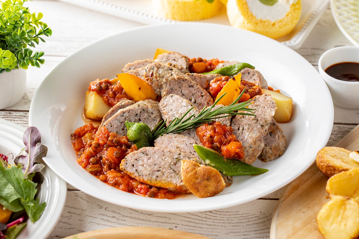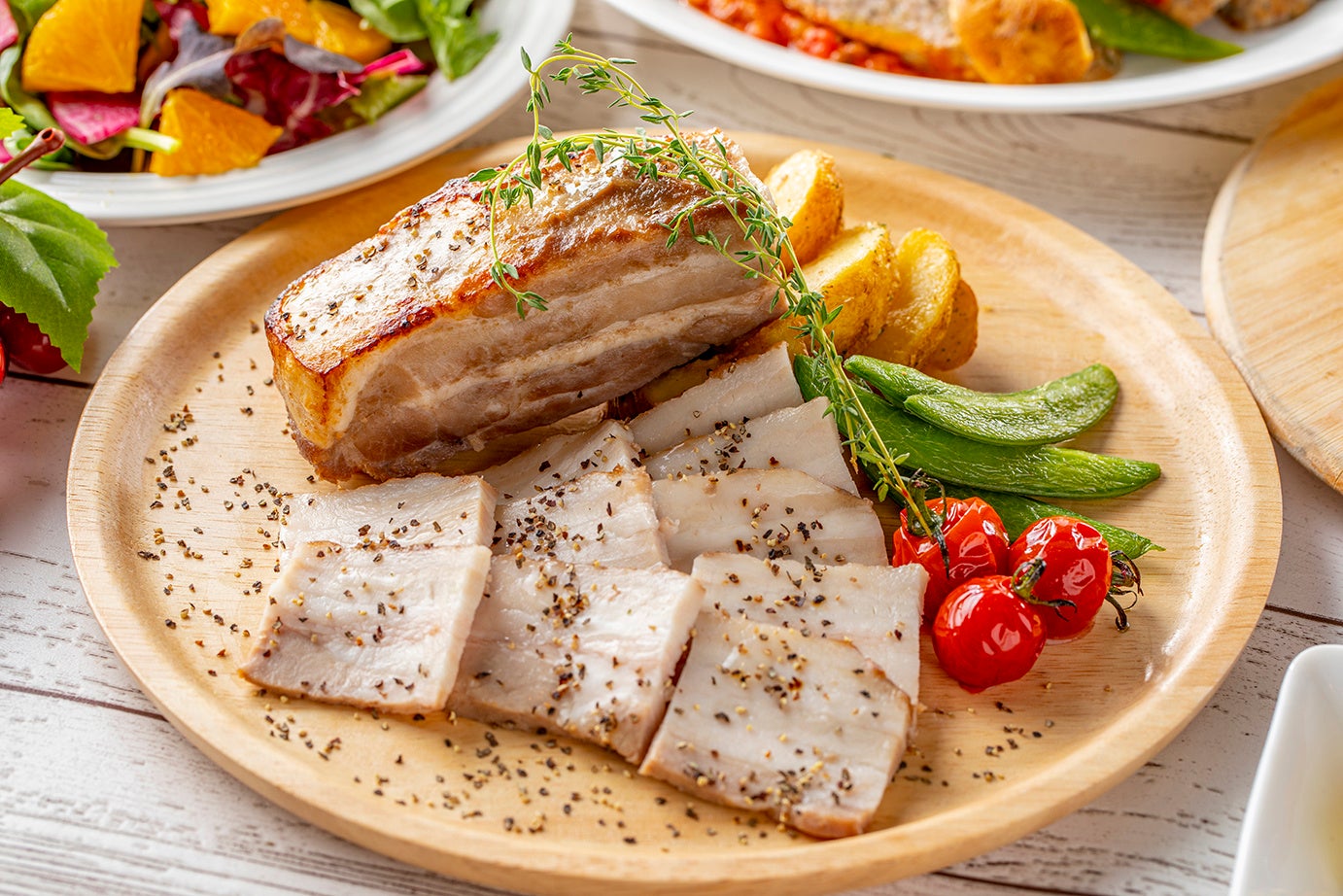 (写真左)豚バラ肉のロースト(写真中央)サルシッチャとレンズ豆のラグー (写真右) 牛肉のステーキ(ディナー限定)