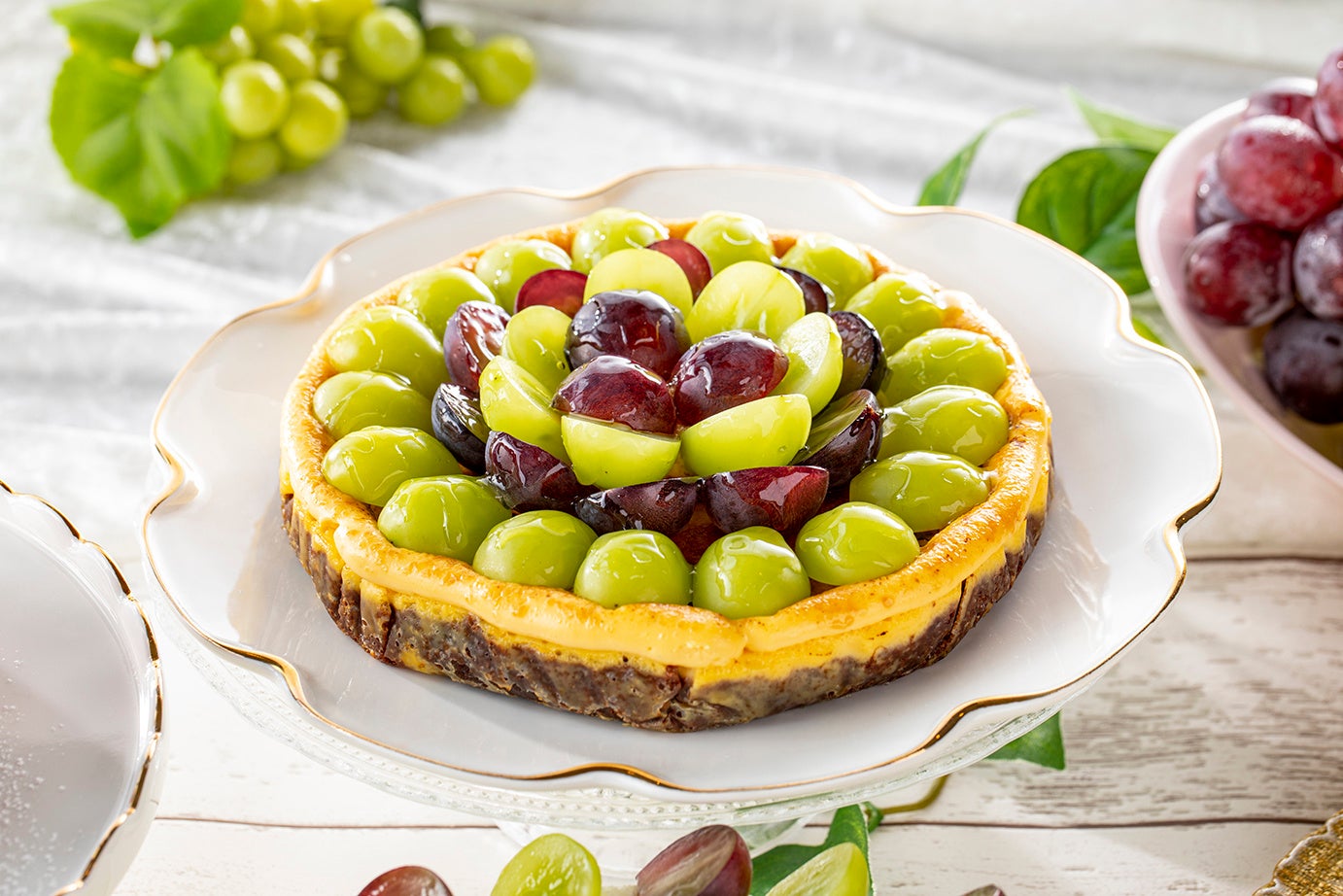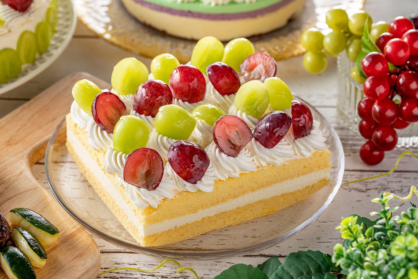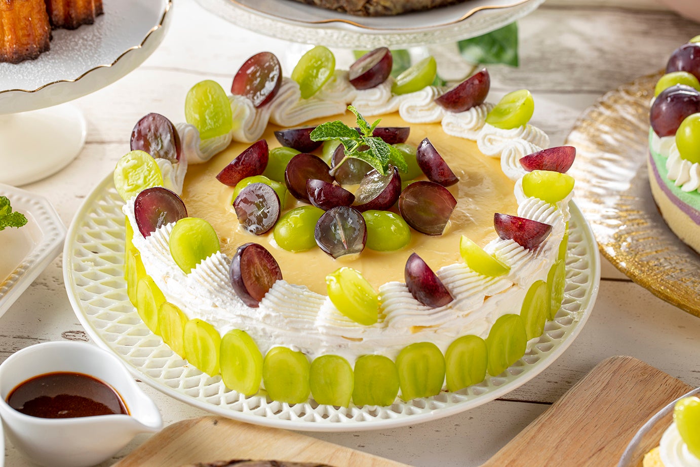 (写真左)シャインマスカット&巨峰のフレジェ (写真中央)シャインマスカット&クインニーナのフロマージュケーキ (写真右)シャインマスカット&巨峰のブリュレタルト