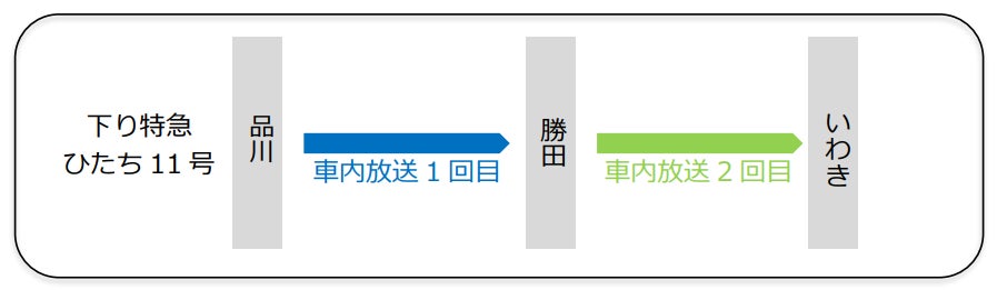 ・特急ひたち11号の車内放送は、「品川~勝田」「勝田~いわき」のそれぞれの区間で各1回のみ実施となります。