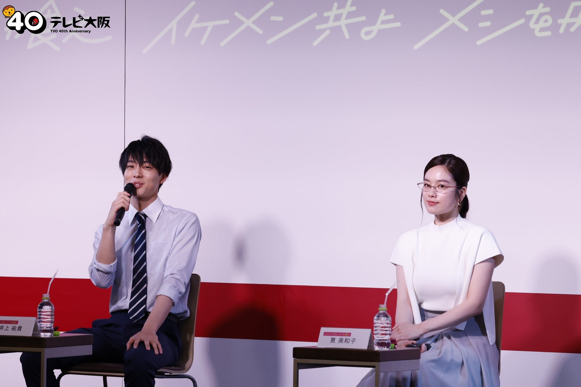 土曜深夜の『真夜中ドラマ』枠で、7月9日(土)深夜からスタートしたのが、『イケメン共よ メシを喰え』。この作品は話題のコミック本を原作とした「イケメン」と「グルメ」を掛け合わせたハイブリット新感覚ドラマ。放送に先立ち主演のイケメン好きなオタク女子・池田好美役を務める筧美和子と、レギュラー出演のイケメン新入社員・細見賢人役を務める井上祐貴が記者会見に臨んだ。