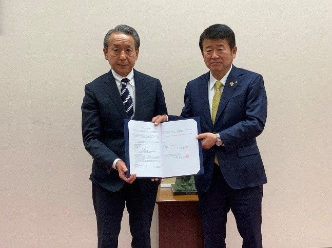 覚書に締結した中小機構中部本部・茂木本部長(左)と半田信用金庫・古田理事長(右)