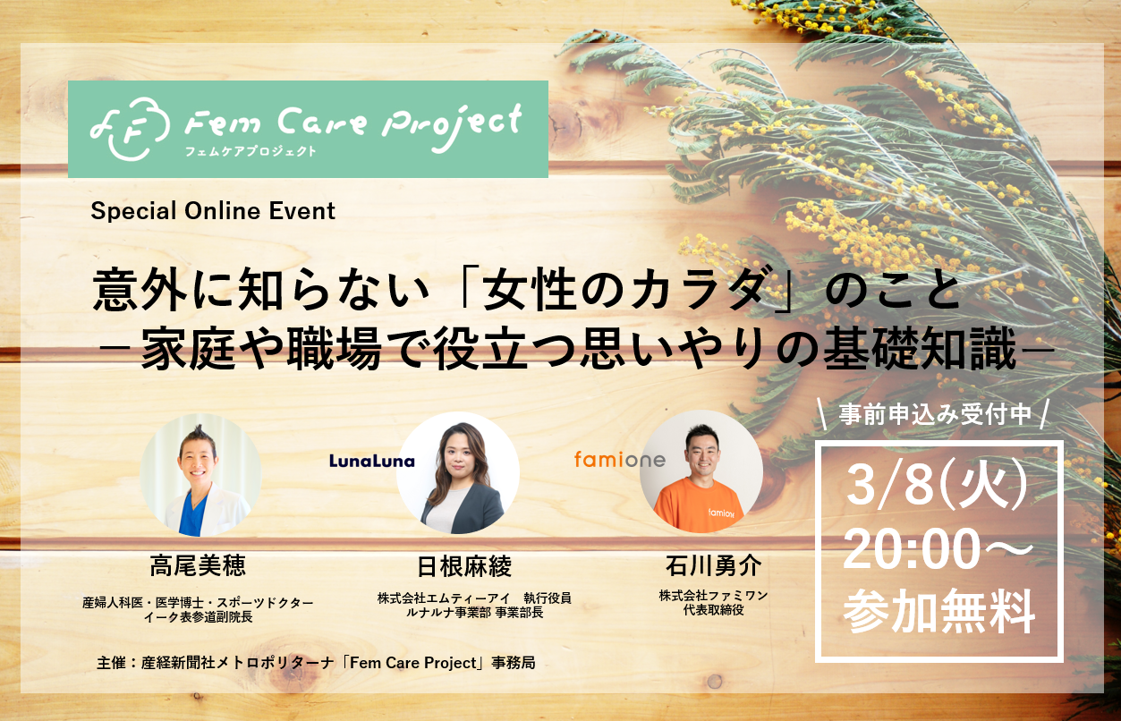 意外に知らない「女性のカラダ」のこと -家庭や職場で役立つ思いやりの基礎知識- フェムケアプロジェクト・オンラインイベント3月8日開催