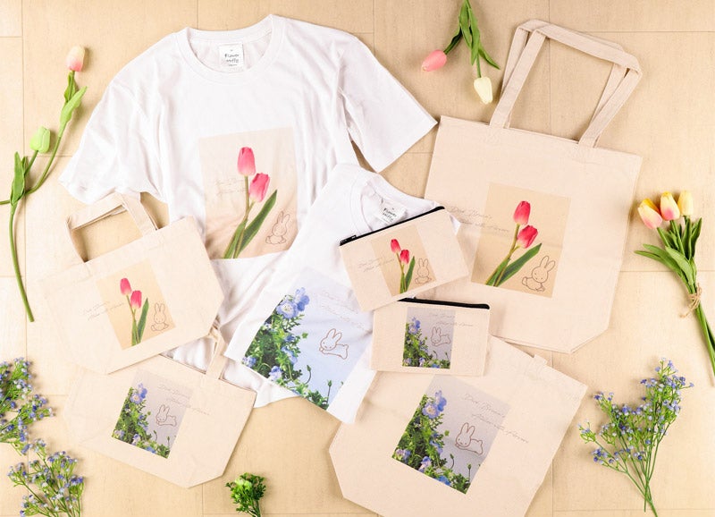フラワーミッフィー サンシャインシティアルパ店で扱う生花を撮影し、ミッフィーやうさぎのイラストをあしらった、フラワーミッフィーだけのフォトプリントデザインのシリーズです。チューリップとネモフィラのお花の二つのデザインで、トートバッグ、ランチトートバッグ、フラットポーチ、Tシャツのラインアップを発売いたします。