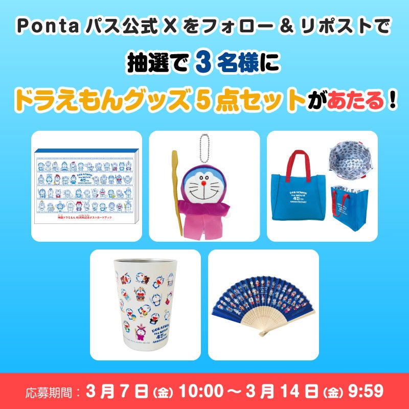 概要:『映画ドラえもん』シリーズ42作品&『STAND BY ME ドラえもん』シリーズ2作品見放題配信を記念して、Pontaパス公式Xアカウントをフォロー&リポストでドラえもんオリジナルグッズセットをプレゼントします。