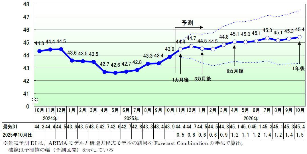 景気予測DIは、ARIMAモデルと構造方程式モデルの結果をForecast Combinationの手法で算出。破線は予測値の幅(予測区間)を示している