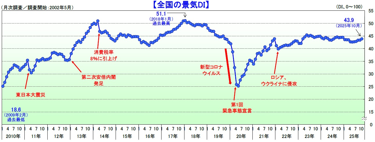 2025年10月の景気DIは43.9となり前月から0.5ポイント増加した。2020年10月以来5年ぶりに5カ月連続で改善。国内景気は、新政権への期待などを受けた株高を追い風に、幅広い業種で景況感が持ち直す動きが続いた。