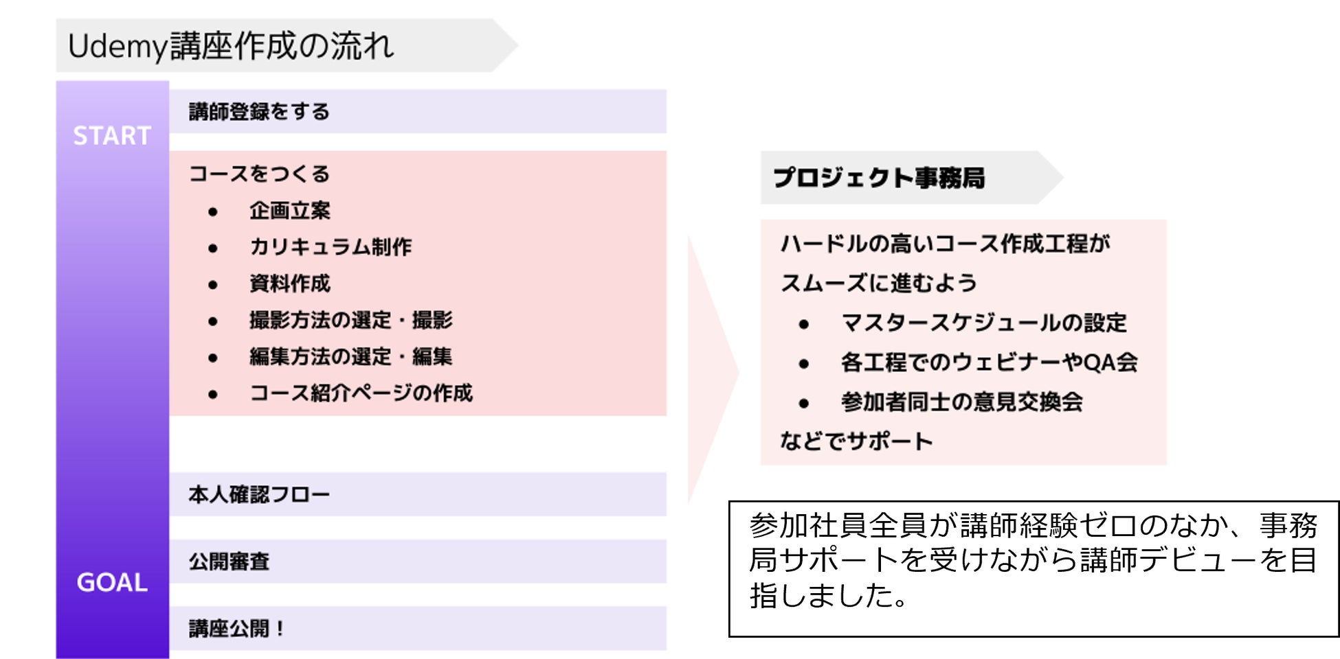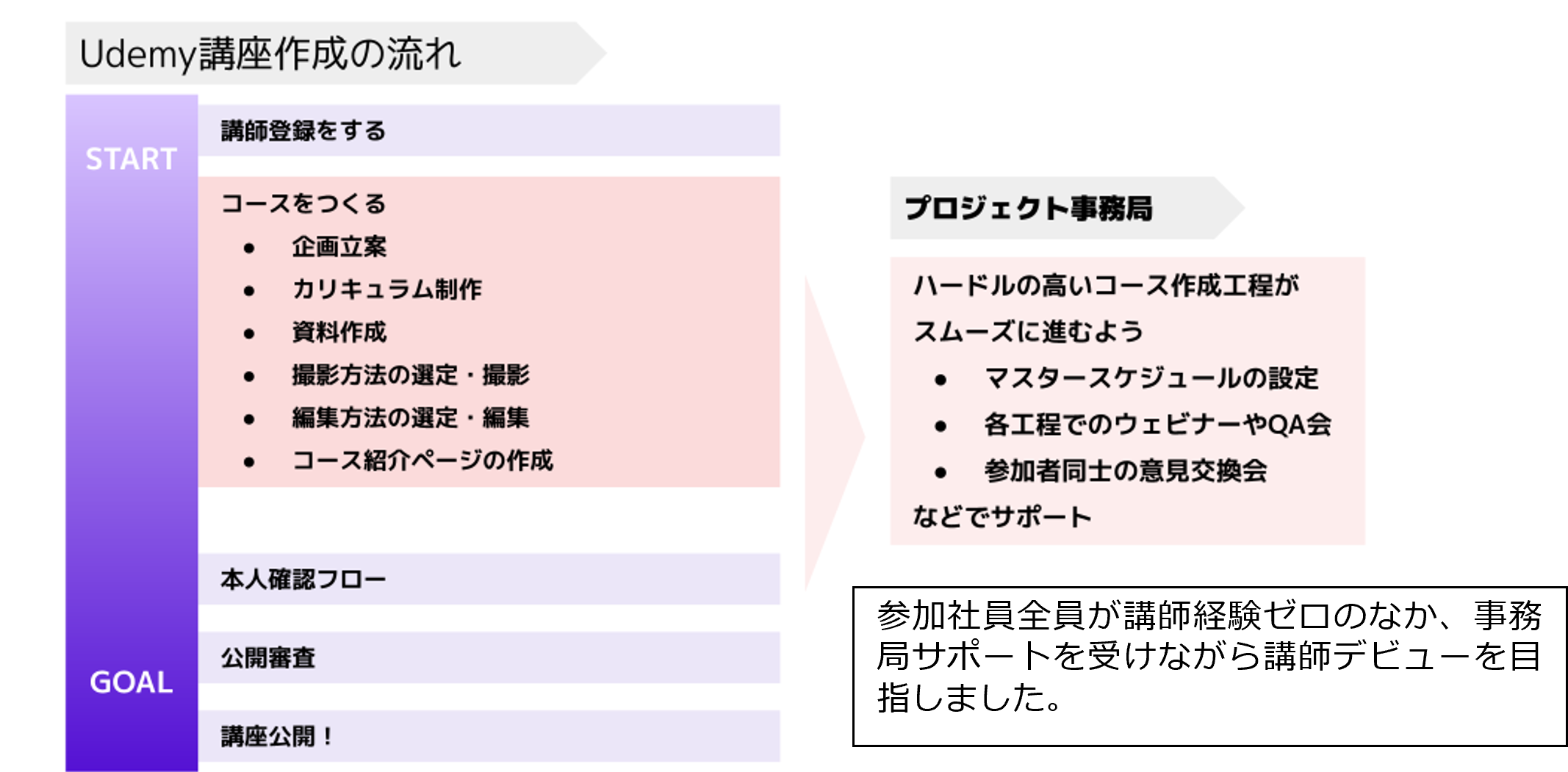 Udemyは、ベネッセが国内で展開するオンライン学習プラットフォームで、教えたい人(講師)は自ら学習コンテンツを制作し、Udemy上で販売できます。講師は各分野の実務経験を持ち、会社員も兼業という形で多く活躍しています。 ベネッセでは2021年からグループ全社員が法人向けサービス「Udemy Business」 を利用しています。利用する社員からは、自身のスキル・経験を教える立場として社外還元したいといった声もありました。そこで2023年2月に国内Udemy事業を運営する社会人教育事業本部が事務局となり、「Udemy講師デビュープロジェクト」が始まりました。
