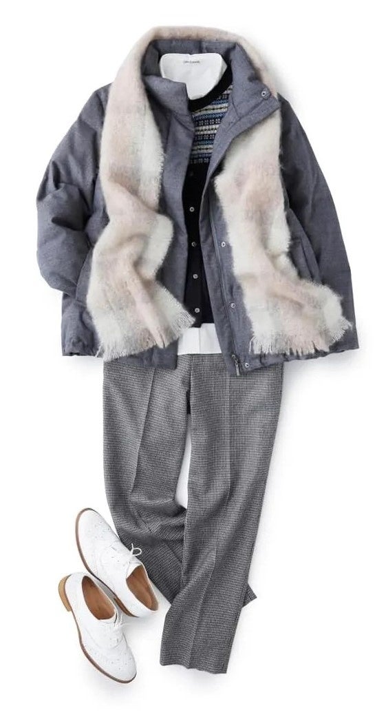 スタイリッシュなダークグレーには、クラシカル要素をプラスしてトラッドな雰囲気に。レイヤードした白シャツの裾をあえて出したスタイリングや、もこもことした毛足の長いマフラーをアクセントにすれば、大人の女性に相応しい洒落感が演出できます。