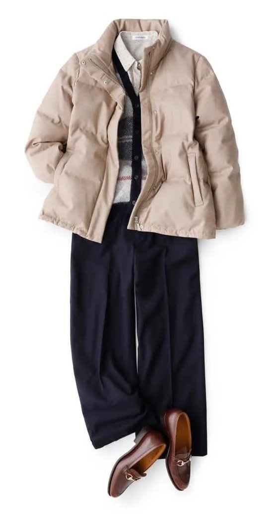 甘い印象のキャメルには、端正なネイビーアイテムを合わせることで知的な大人の雰囲気に。全体のバランスの取りやすさも魅力のコートは、ダウン特有の着ぶくれ感が少なく、太めのストレートパンツを合わせても、旬なシルエットにまとまります。