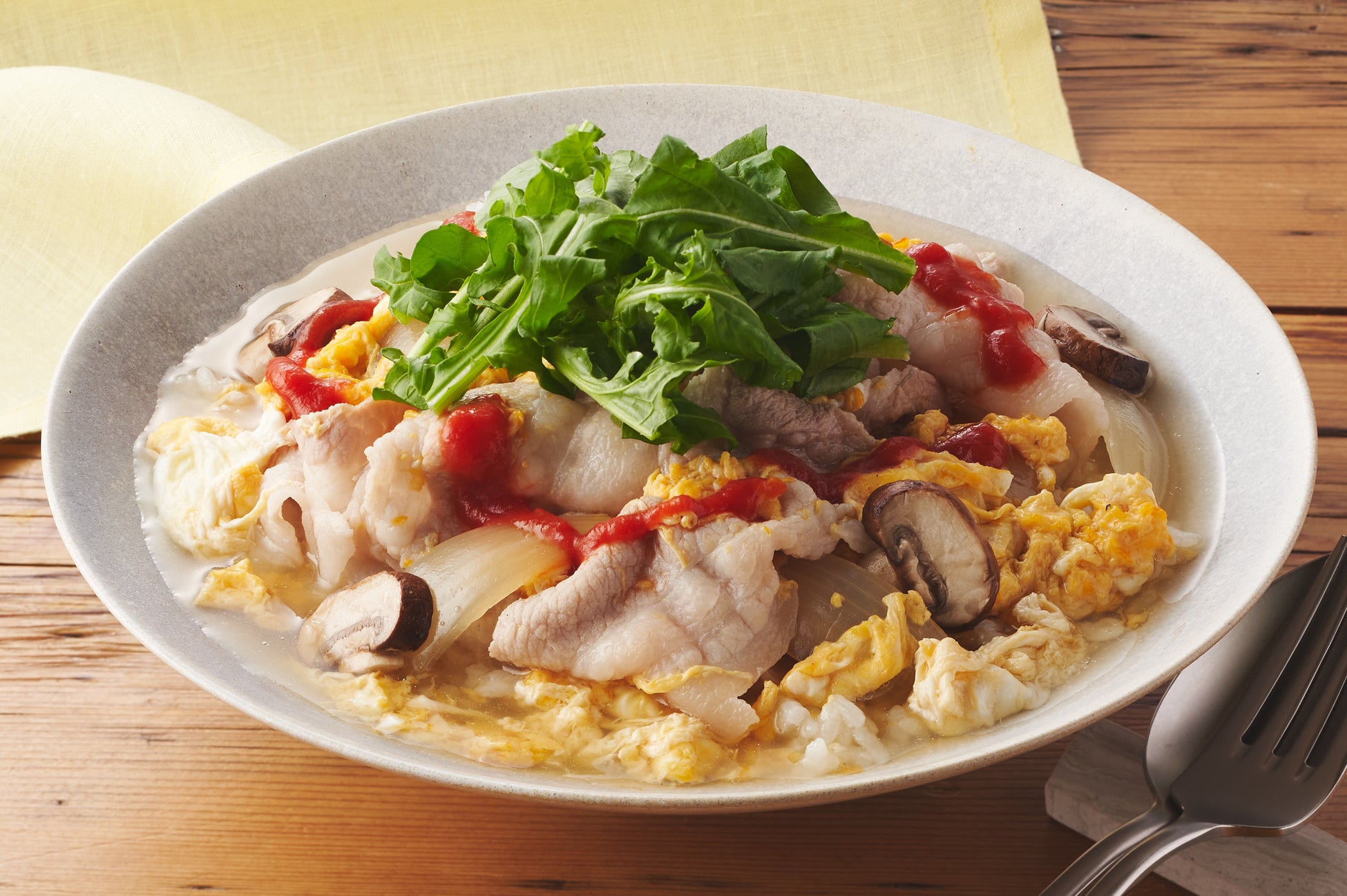 奥田シェフ提案の「丼」メニューは、和食の定番・親子丼から想起された、シェフにしか出せない味わいです。シェフの味作りを再現するため、パンチェッタ風に仕上げた豚肉・コンソメ・庄内産マッシュルームなど、複数の旨みを重ねることで、出汁の効いた、唯一無二の味わいに仕上がりました。