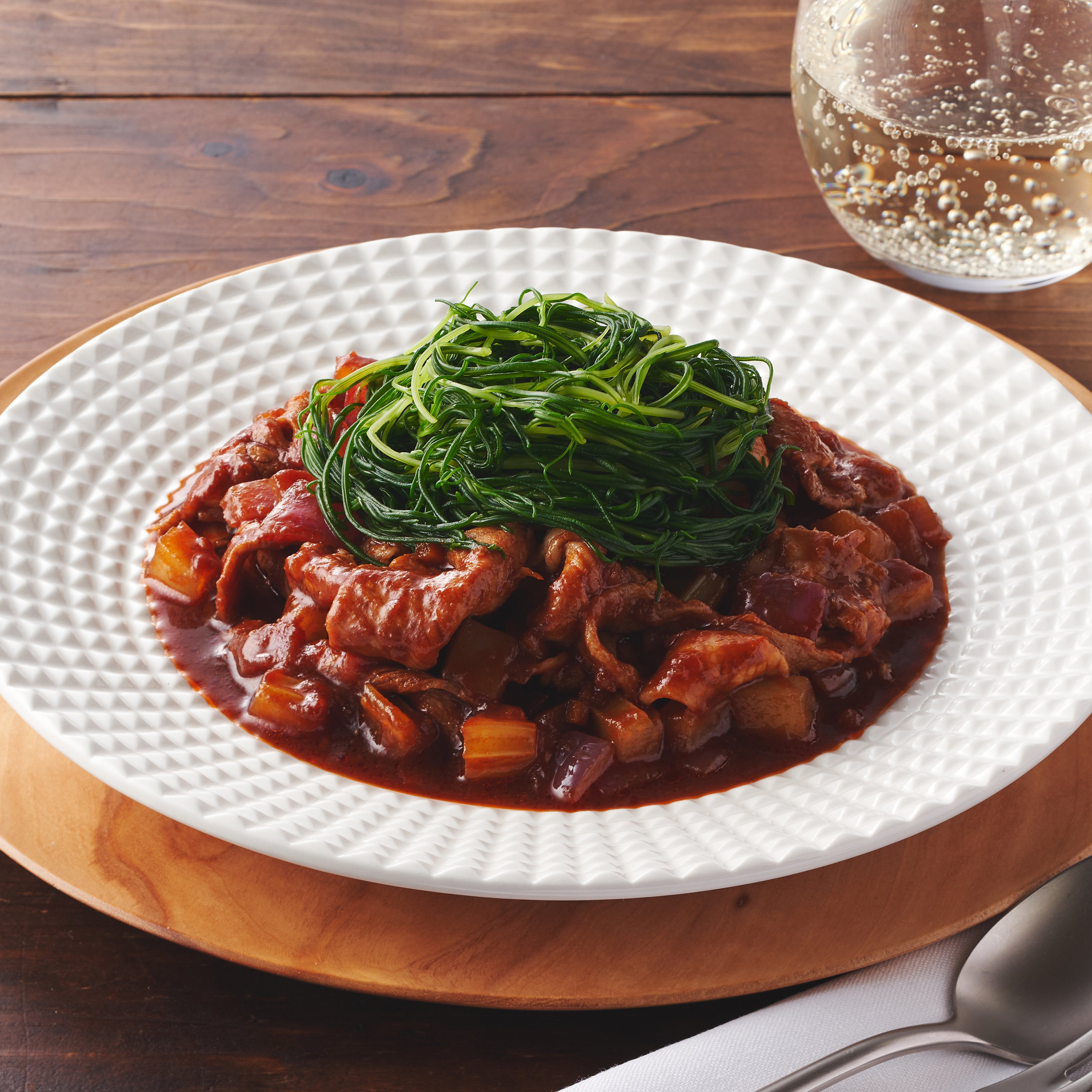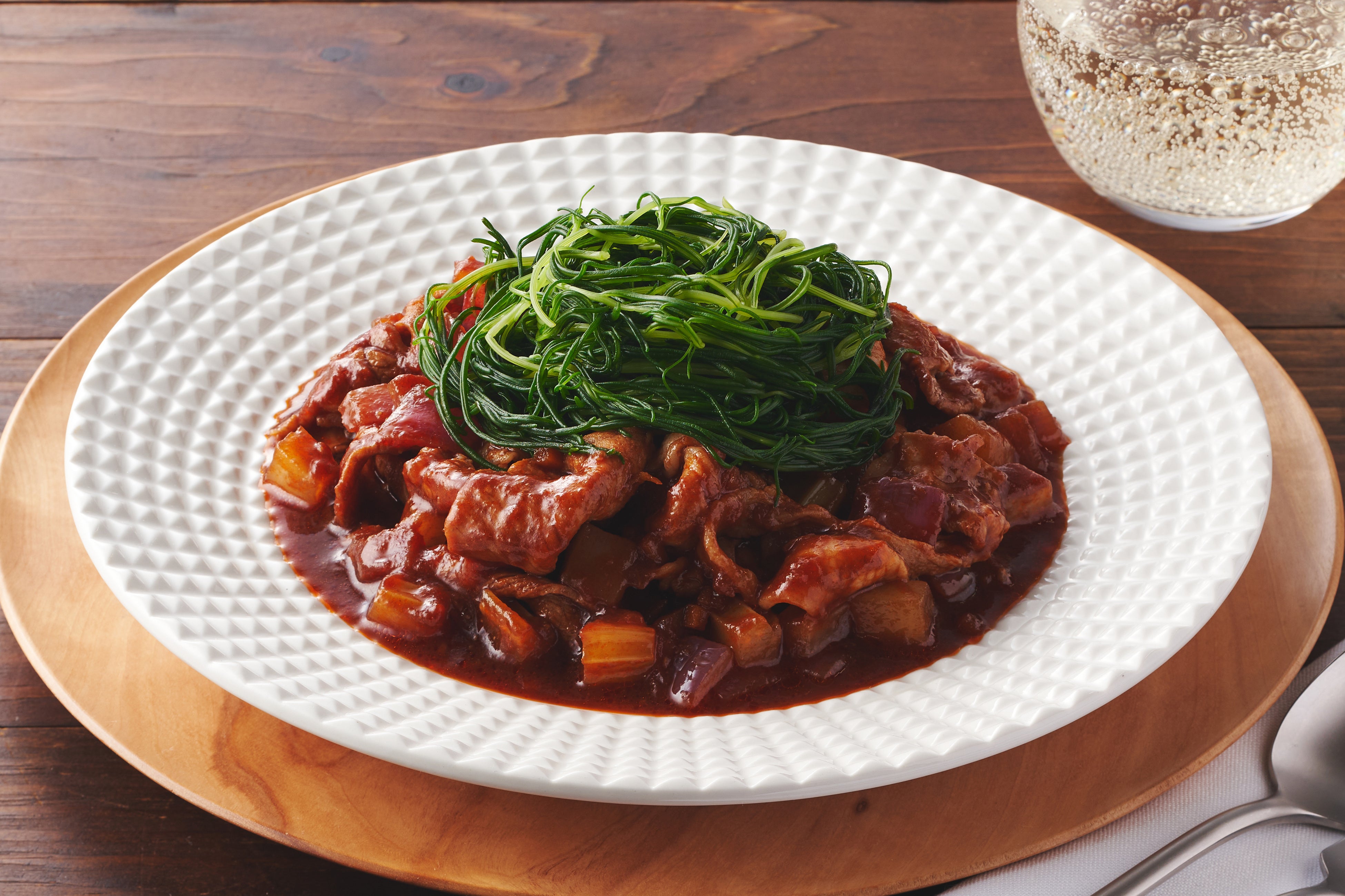 豚肩ロースをトマトソースとバルサミコで煮込んだコク深なトマト煮に、山形産おかひじきを添えました。シャキシャキ食感とさわやかさが濃厚なソースを引き立てます。ごはんにもよく合う、奥田シェフ直伝、10分で完成する本格イタリアンです。