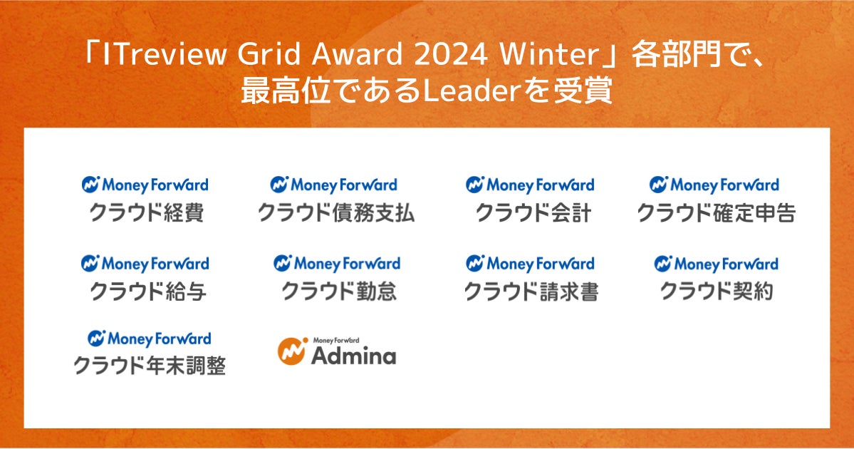 マネーフォワードグループが提供するプロダクトが、アイティクラウド株式会社主催「ITreview Grid Award 2024 Winter」の各部門にて、最高位である「Leader」を受賞しました。今回受賞したプロダクトは、株式会社マネーフォワードのバックオフィスSaaS『マネーフォワード クラウド』の9プロダクトと、マネーフォワードi株式会社の情シス向け業務OS『マネーフォワード Admina』です。