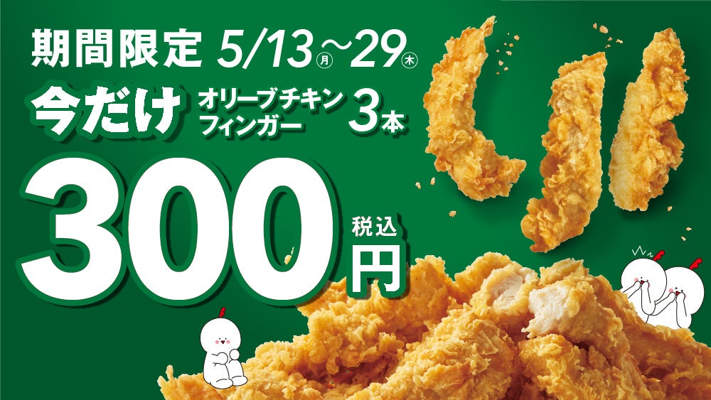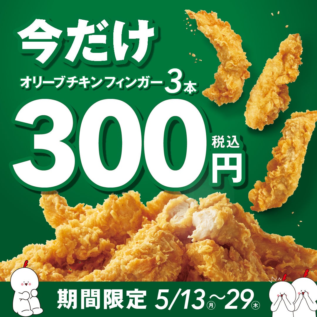 『オリーブチキンカフェ』が2016年12月に日本上陸した当時より販売し、多くのお客様に愛されながら累計1,000万本以上の販売をしてきた人気メニュー『オリーブチキンフィンガー3本』を通常380円のところを300円(税込)で販売するキャンペーンを実施します。※本キャンペーン実施にともない、期間中は『オリーブチキンフィンガー10本』も通常1140円のところを1,000円(税込)にて販売いたします。