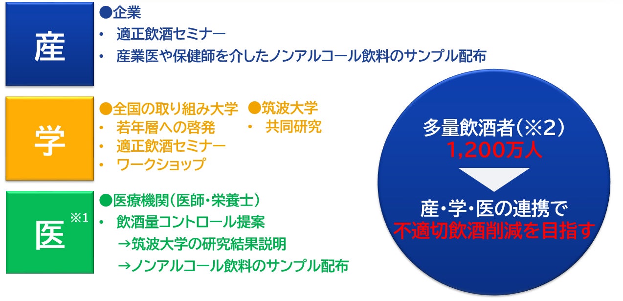アサヒビールと筑波大学の共同研究により“飲酒量が多い人にノンアルコール飲料を提供することで飲酒量が減少する”ことが実証されています。今回は、医療従事者が生活習慣病のリスクを高める量を飲酒している方に対して保健指導を実施する際に、筑波大学との共同研究結果の内容を伝えるとともに、ノンアルコール飲料を配布することで、飲酒量コントロールの提案を実施します。対象は年間約52万人を見込んでいます。