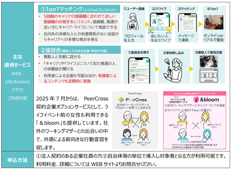 〇今後も「PeerCross」は、ワーキングマザーやライフイベント前の女性等、当事者向けのサービスとして、個人の状況に応じた前向きなキャリア形成に繋がる出会いを提供し、女性活躍推進を支援します。