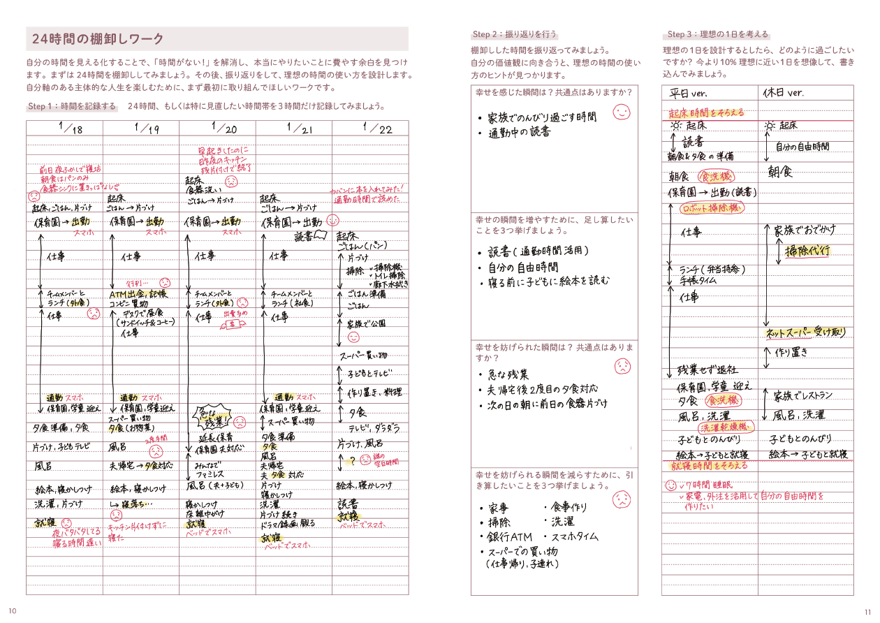 手帳の使い方がわからない方のためには、別冊『自分軸手帳サポートガイド』で主なページの記入例を徹底解説。一人だと続かない…という方には仲間と手帳習慣を継続できる「自分軸手帳部」もあります。