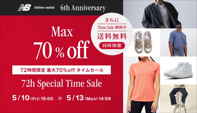 6周年を記念し、最大70%OFFのプライスダウンとなるスペシャルタイムセールの実施や、まとめ買いセール、送料無料キャンペーン等をご用意しています。この機会にぜひニューバランス公式オンラインアウトレットでのショッピングをお楽しみください。