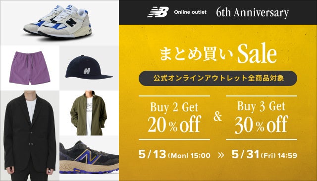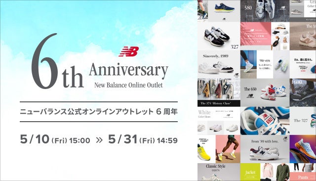 株式会社ニューバランスジャパン(本社所在地:東京都千代田区、代表取締役社長 久保田伸一)は、5月10日(金)15:00から5月31日(金)14:59までの期間限定で、「ニューバランス公式オンラインアウトレット6周年祭」を開催いたします。2018年5月にオープンした公式オンラインアウトレットは、前シーズンの各カテゴリーのシューズ、アパレル、アクセサリーを割引価格で販売しています。