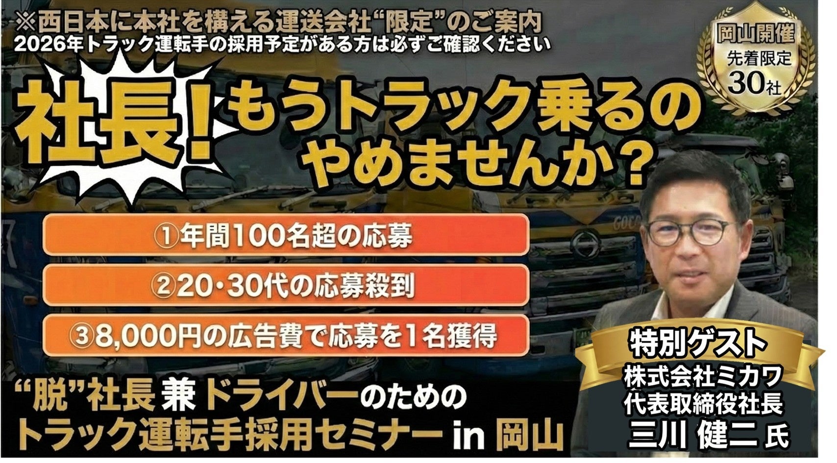 2026年3月19日(木)開催|“脱”社長 兼 ドライバー のためのトラック運転手採用セミナー in 岡山|株式会社船井総研サプライチェーンコンサルティング