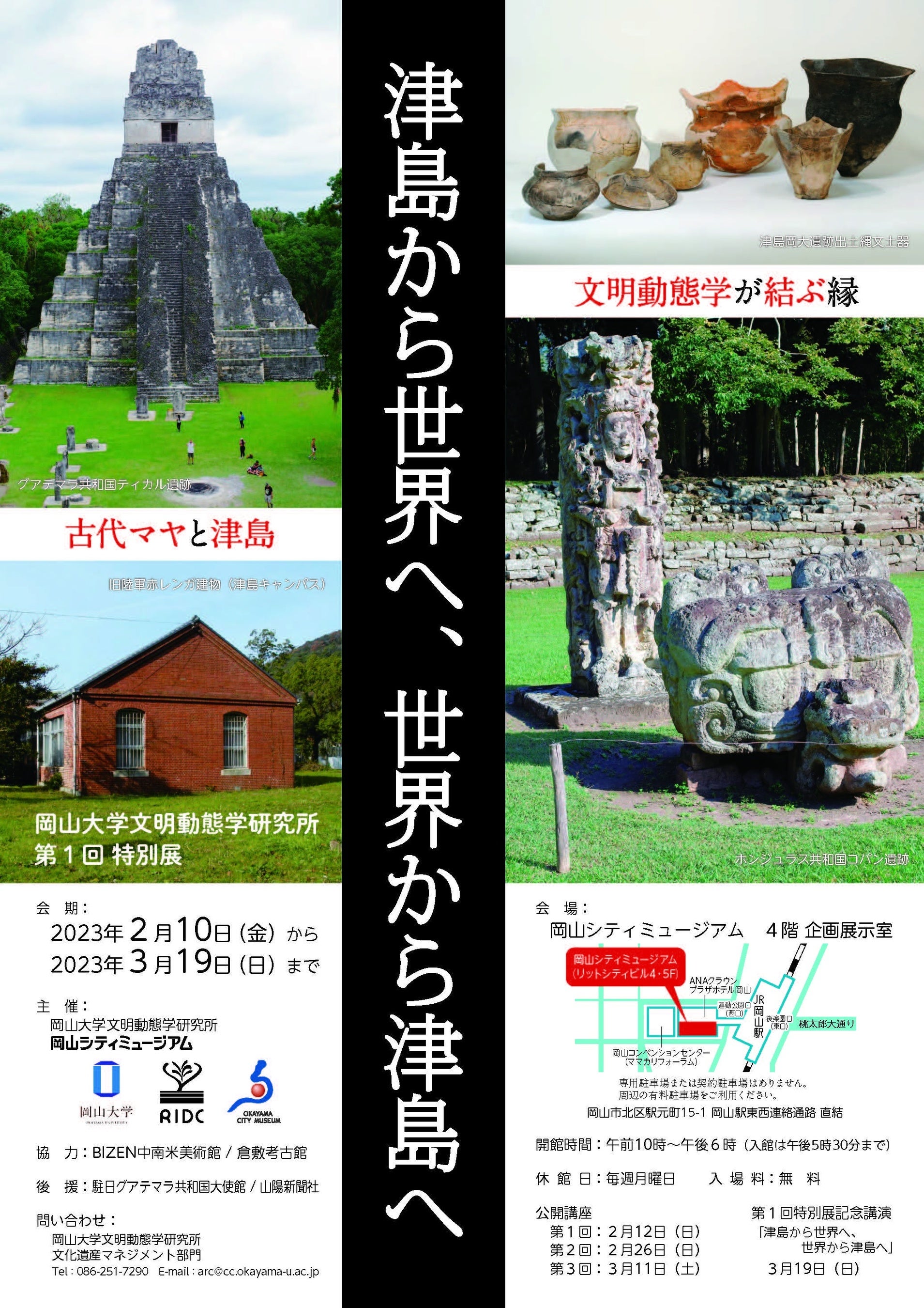 国立大学法人岡山大学(本部:岡山市北区、学長:槇野博史)の文明動態学研究所では、2023年2月10日(金)~3月19日(日)、第1回特別展 『津島から世界へ、世界から津島へ』をJR岡山駅前の岡山シティミュージアム(岡山市北区駅元町)で開催します。