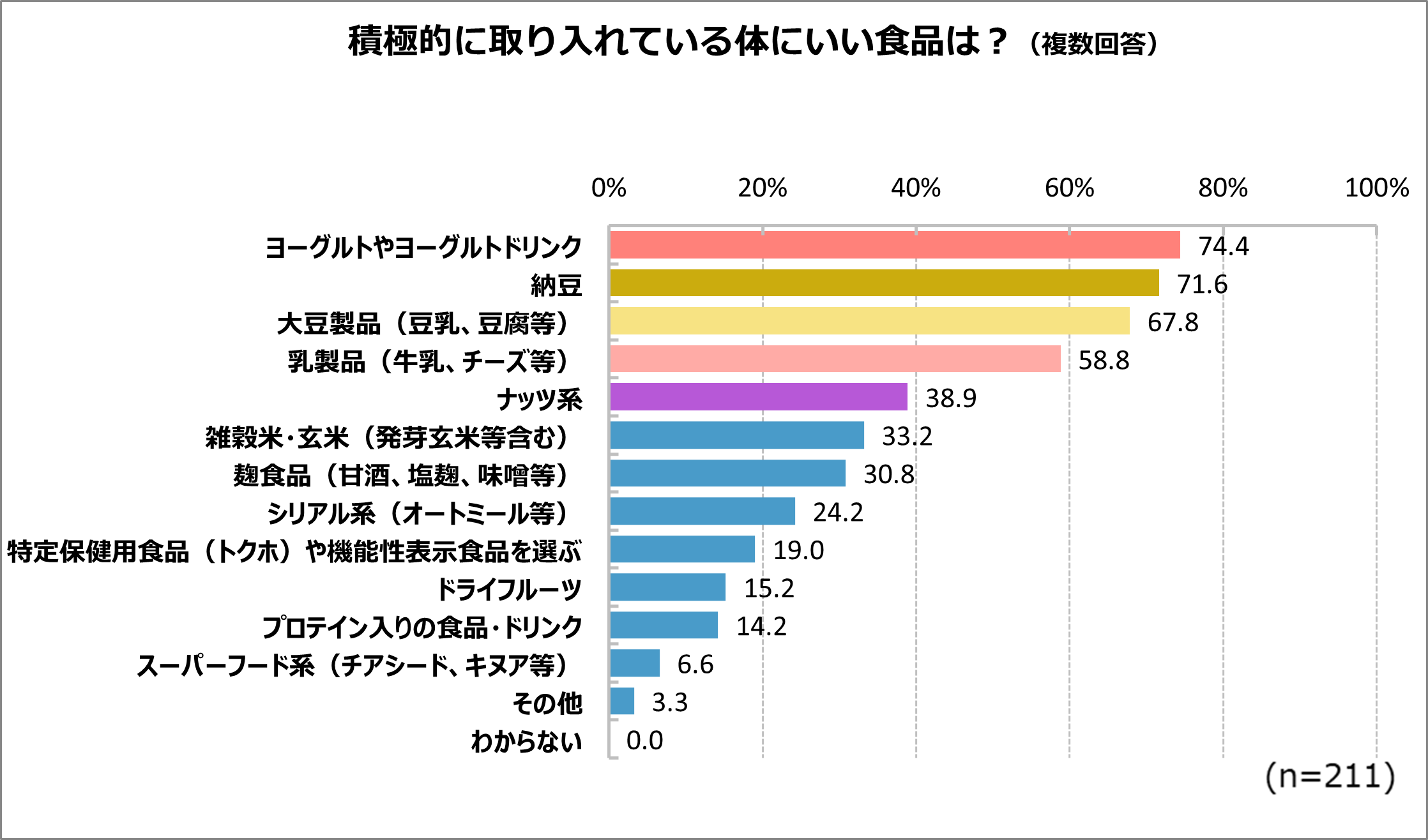 ヨーグルトなど乳製品が、最も多く「体にいい食品」として選ばれているほか、大豆製品、ナッツ系がロカボブームの影響か上位にあがった。