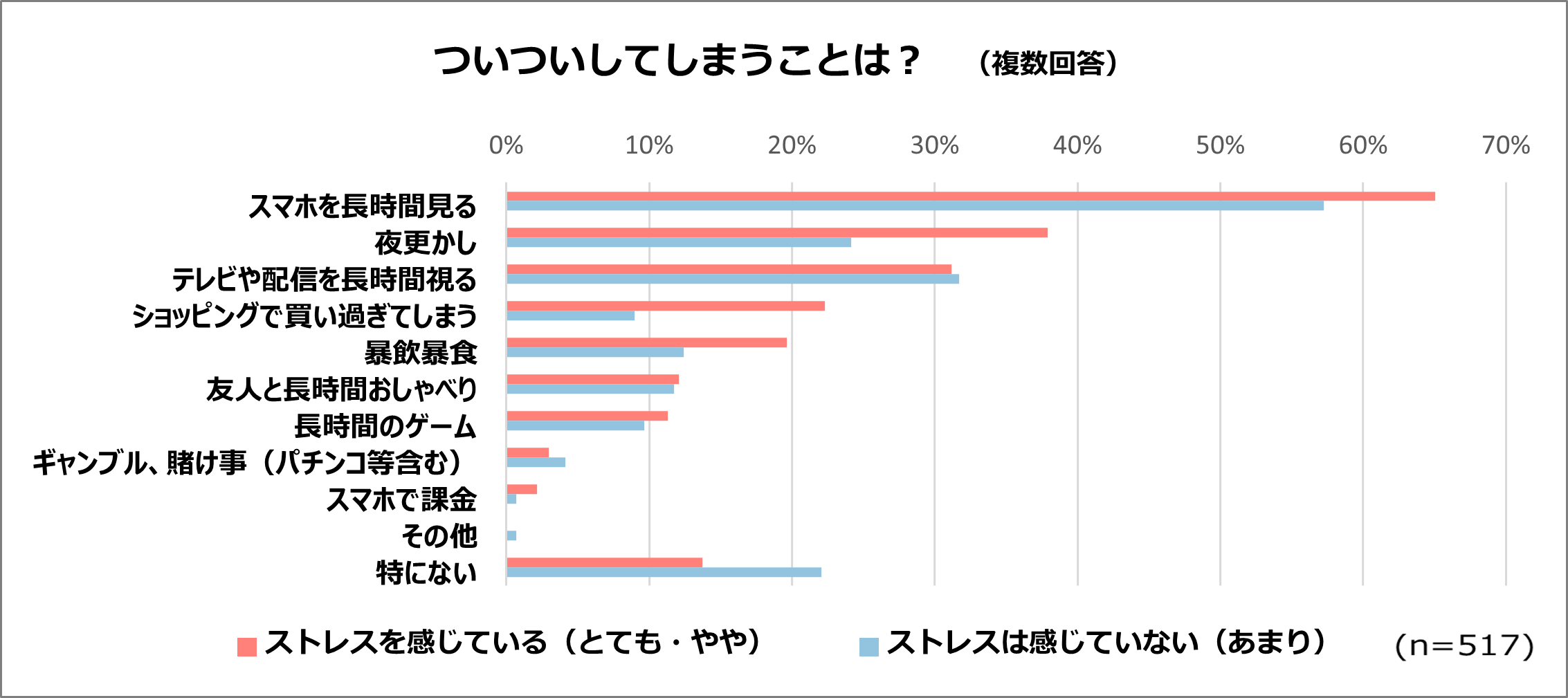 ●ついついしてしまうこと。ストレスのある人ほど、夜更かし・暴飲暴食・買いすぎ