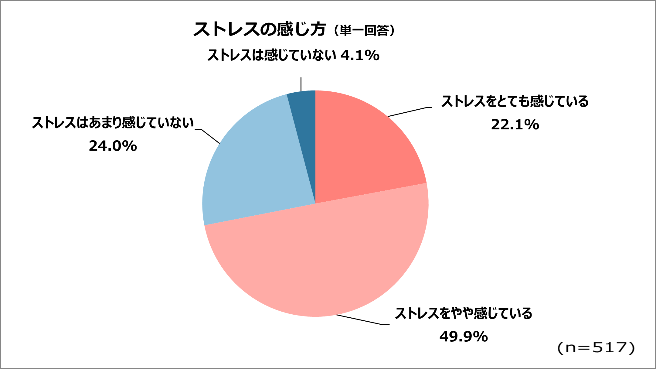 現在のストレスの感じ方で最もお気持ちに近いものをお選びくださいという設問に対し、「ストレスをとても感じている」人は約22%、「やや感じている」人は約50%と、合わせて約7割の人がストレスを感じていることがわかった。