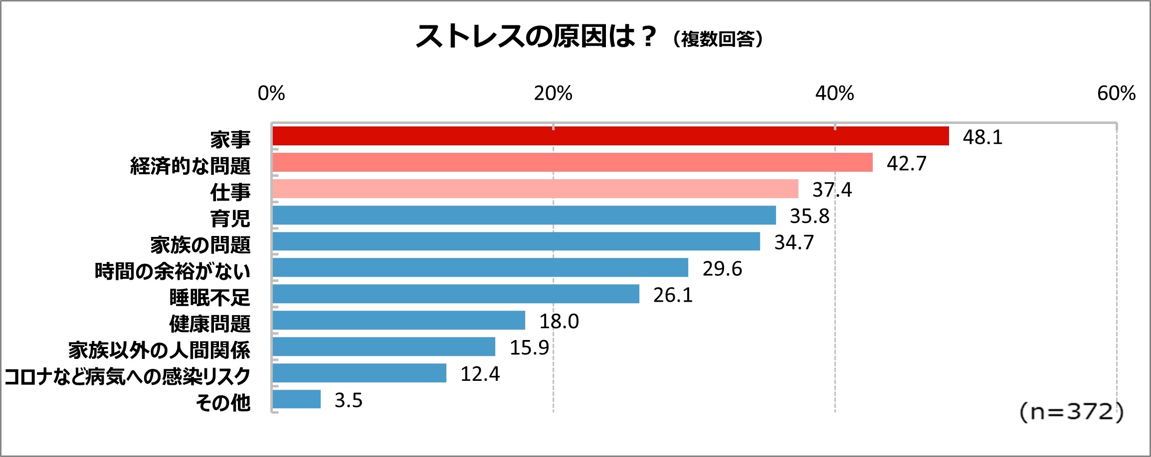 ストレスの原因として当てはまるものを聞いたところ、家事がトップ。共働きが増えているものの、女性に家事の負担が偏る現状が背景にあると考えられる。子どもの有無で傾向の差は見られなかった。