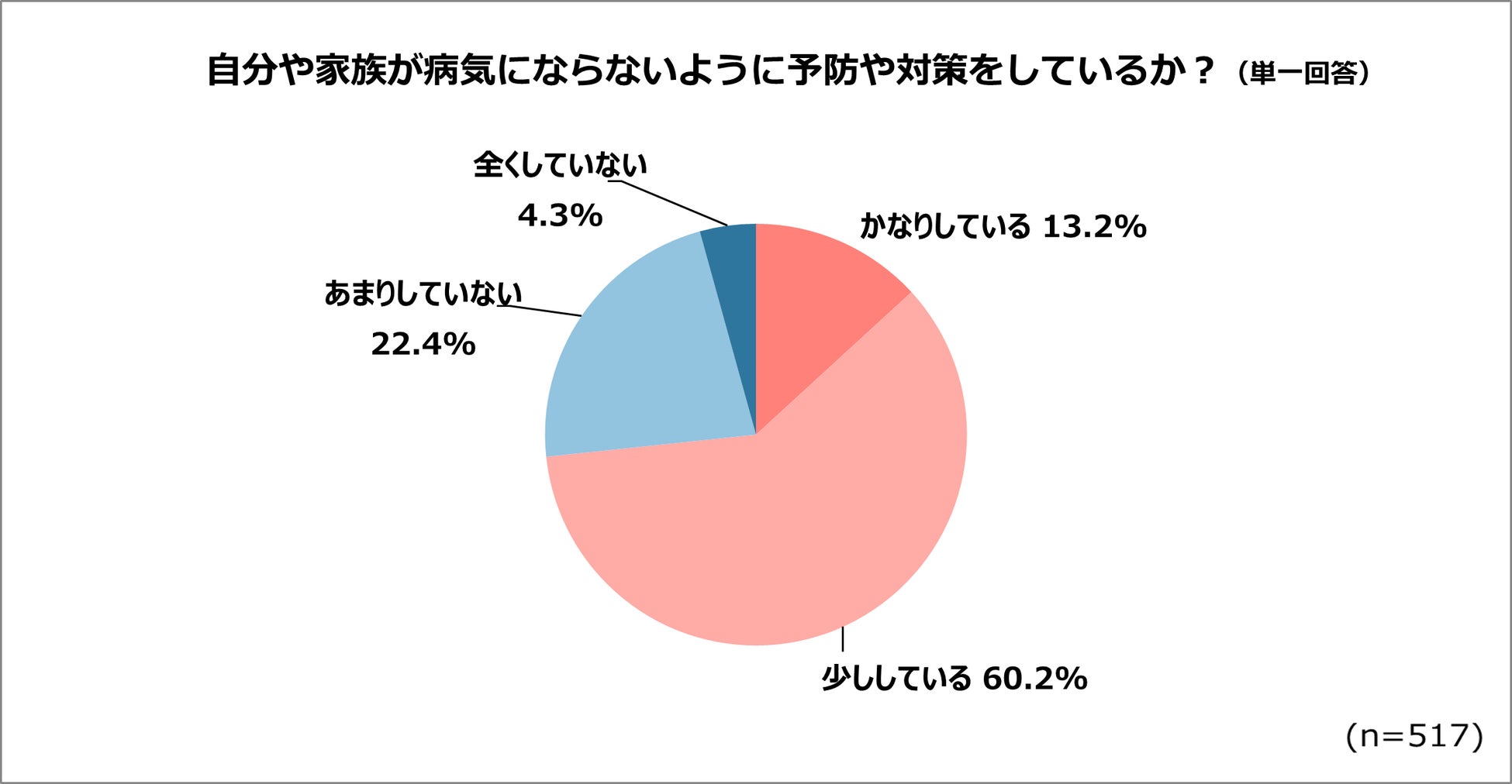 自分や家族の健康について、あなたのお気持ちに最も近いものをお選びください、と聞いたところ、自分や家族が病気にならないよう対策や予防を「かなりしている」「少ししている」という回答が合計で7割超に。