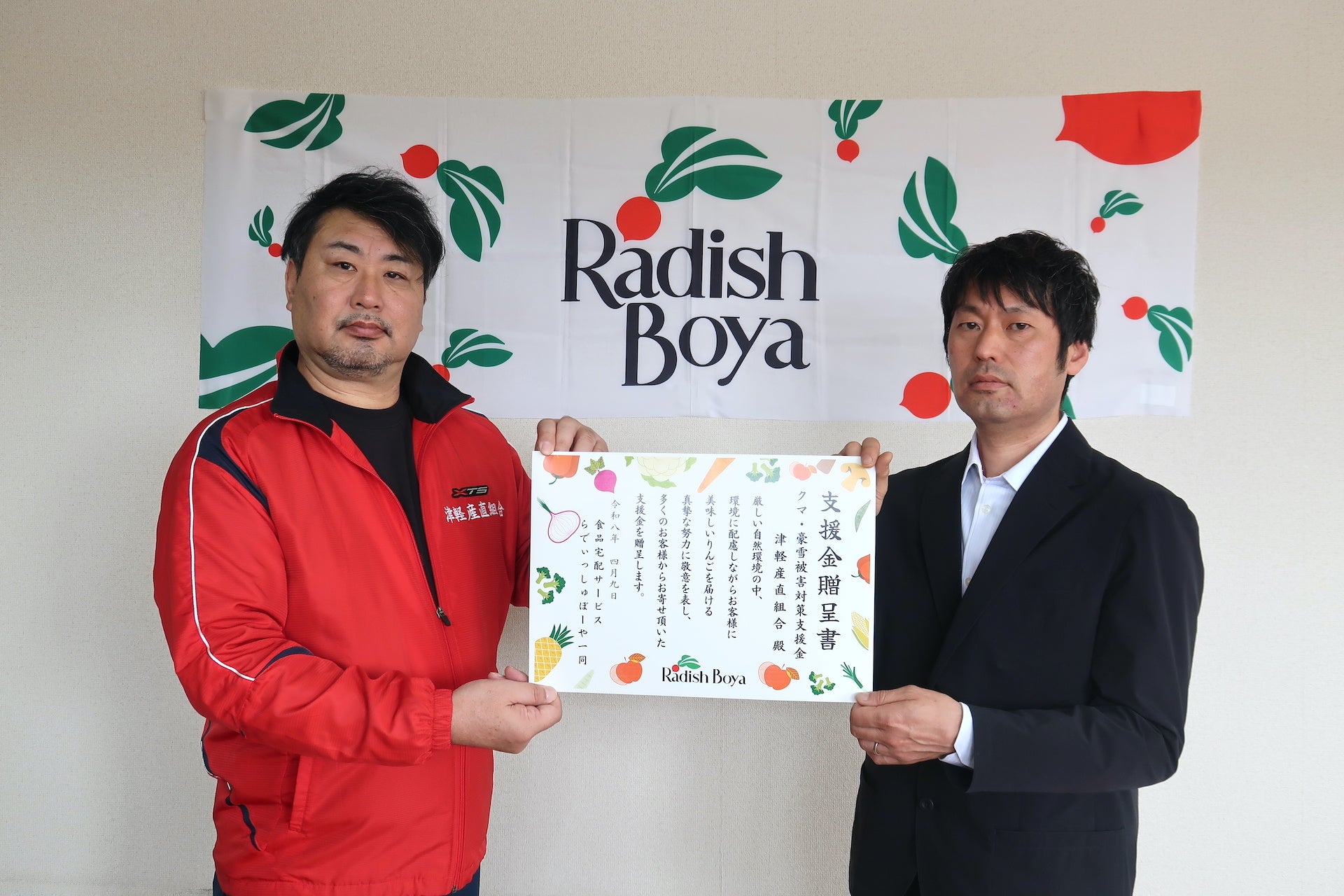 食品のサブスクリプションサービスを提供するオイシックス・ラ・大地株式会社(本社:東京都品川区、代表取締役社長:高島宏平)が展開する「らでぃっしゅぼーや」は、クマ被害や記録的豪雪に直面した青森県のりんご生産者を支援するため、寄付金付き商品の販売を通じた支援金の贈呈式を2026年4月9日に執り行いました。青森県内では3月中旬から雪解けが始まり、3月下旬にかけて積雪に隠れていた園地の甚大な被害が次々と明らかになりました。この状況を受け、産地の継続的な営農を支援するため、2026年4月6日(月)より、らでぃっしゅぼーや会員さま向けに1点につき200〜400円の寄付を募る応援企画を、3産地リレー形式で順次開始。発売開始から1週間で約400人のお客様からご注文いただき10万円以上の支援金が集まっています。