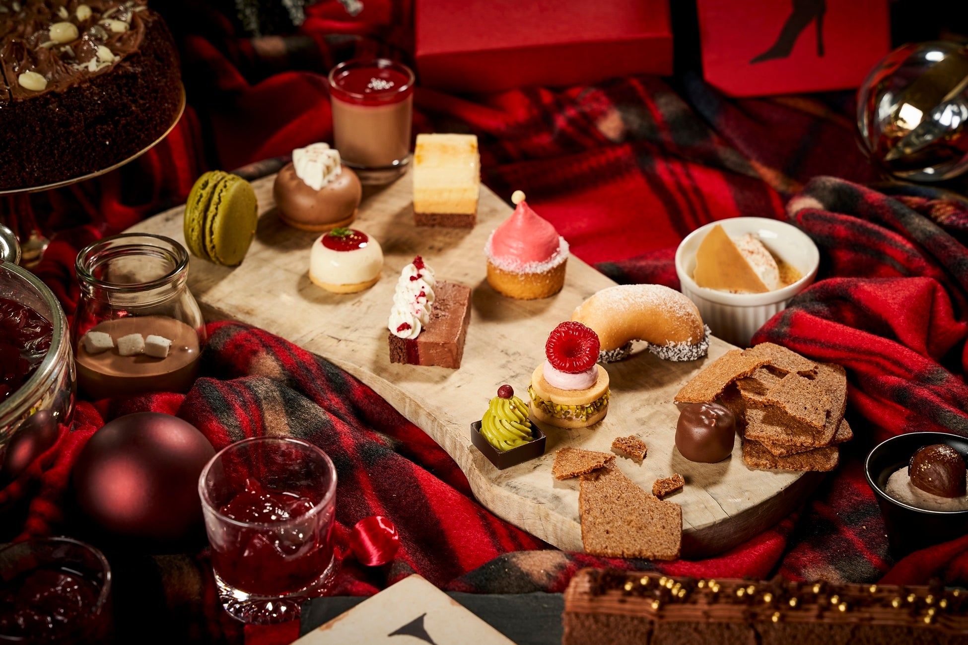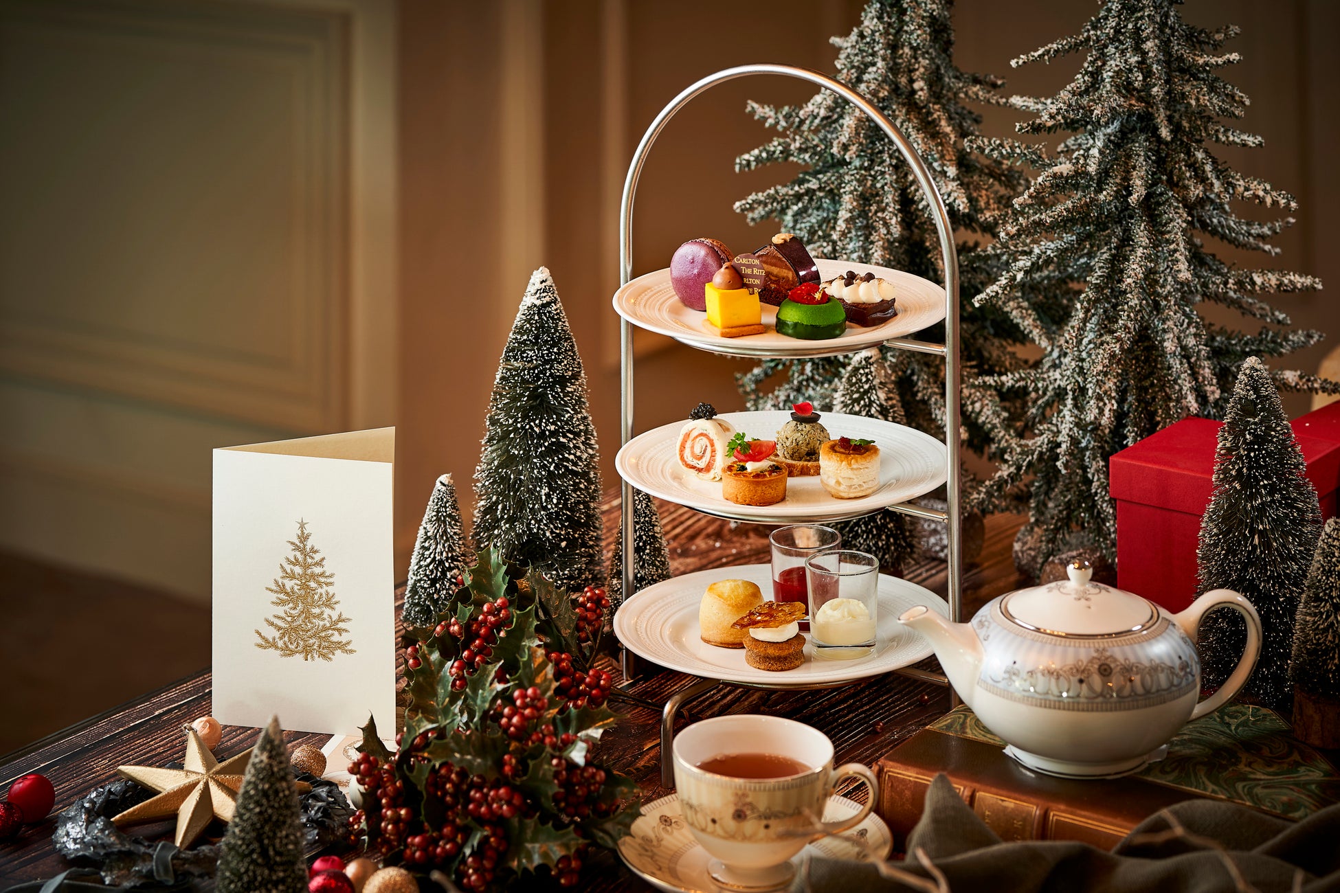 伝統的な英国式の3段スタンドでご提供するアフタヌーンティーセットは、館内のショップで販売するクリスマス商品の中から、「ブッシュ・ド・ノエル」、「クリスマスオーナメント」、「クリスマスギフトリモーネ」、「ショコラテリーヌ」「ジンジャーブレッド」の5種の味を少しずつお楽しみいただける内容です。「アーティチョークとチキンのクネル」や「ミートパイ」など、クリスマスらしいセイヴォリーを添えてご提供いたします。大切な人のことを想うこの時季、まるで素敵なギフトを集めたかのように美しく盛り付けられた、華やかなデザートやセイヴォリーの数々をお楽しみください。