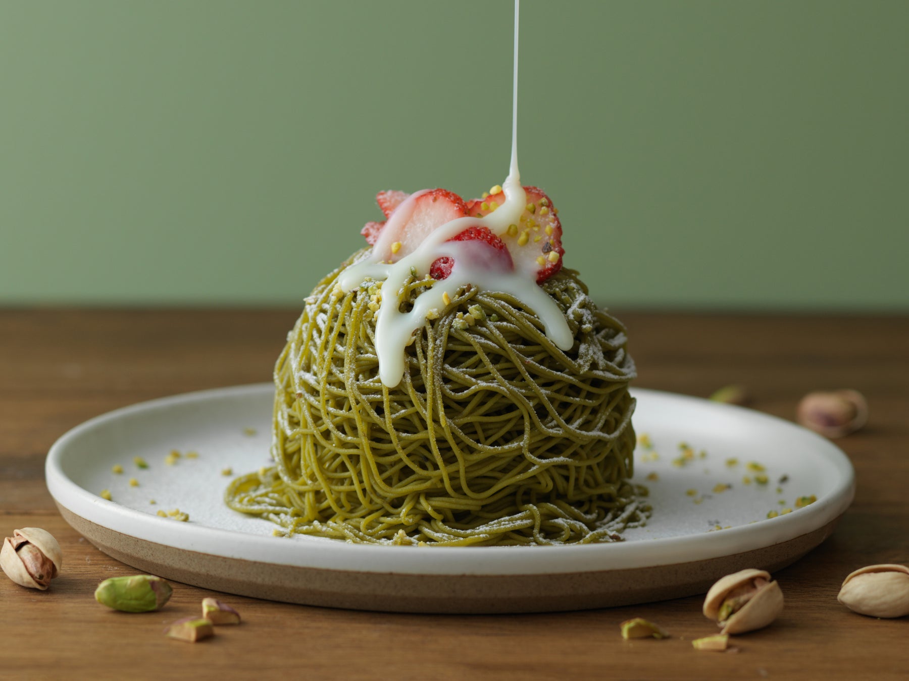 賞味期限10分の出来立てモンブラン「ふわほろモンブラン」より、今年もピスタチオの味を販売いたします。イタリア産ピスタチオと和栗を掛け合わせた、コク深い味わいのマロンクリームを絞りたてでお楽しみいただけます。ジャージーミルクアイスとミルキーでコクのあるオリジナル生クリームを、 1㎜の口金から絞り出される極細モンブランクリームで優しく包み込みました。ナッツの女王といわれるピスタチオの香ばしく濃厚な味わいに、お好みでジャージーミルクソースをかけてお楽しみください。