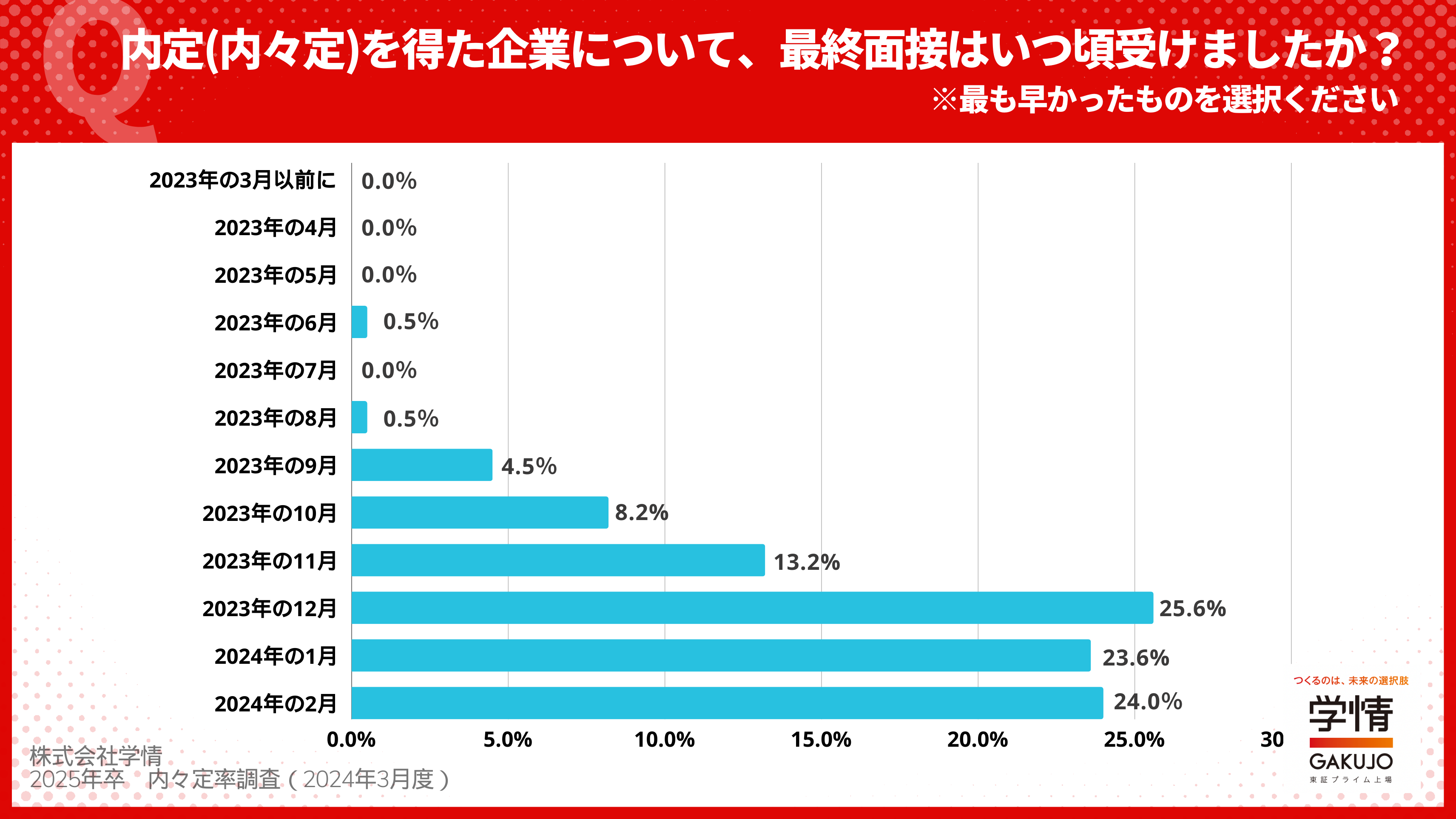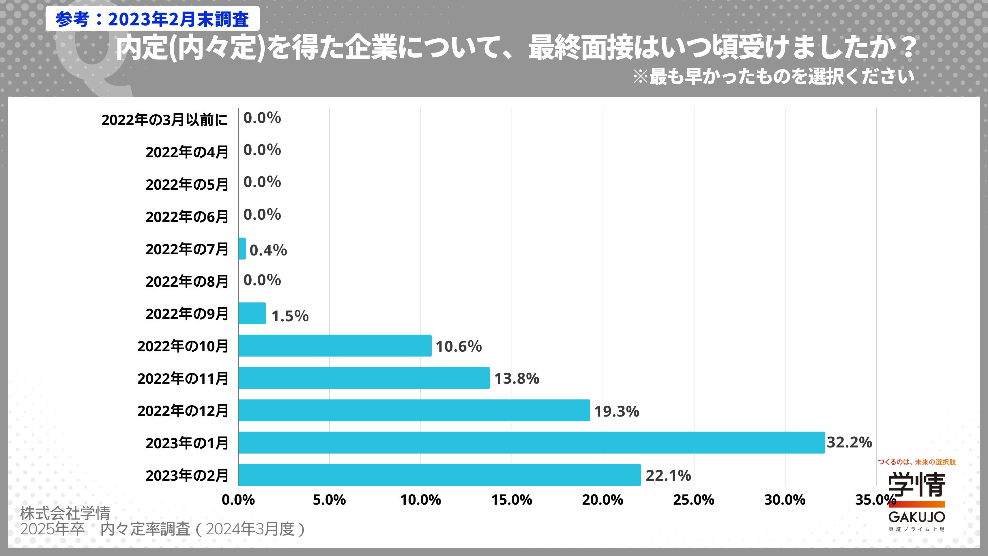 25卒学生の2月末時点の内々定率は<38.1%>。文理別では、理系が<49.1%>と5割に迫る。最終面接の時期は12月が最多の<25.6%>と、昨年よりも前倒しの傾向。