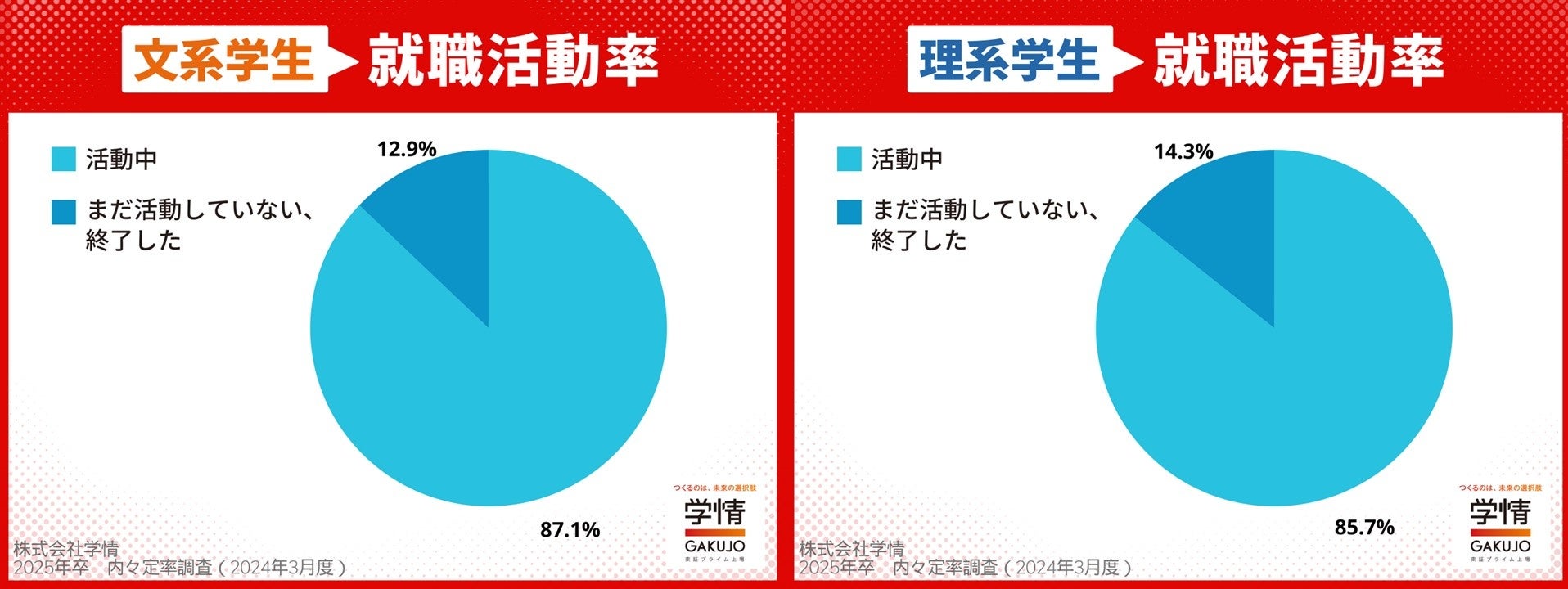内々定を得た会社の最終面接実施時期は、12月が最も多く「25.6%」、次いで2月の「24.0%」となりました。昨年同時期調査では、1月が最も多く「32.2%」次いで2月が「22.1%」と年明け以降に集中していましたが、年内に最終面接を前倒す企業が増加しているようです。一方、“就職活動をしている”学生は「86.6%」で、“内定(内々定)を獲得し、就活を終了”は「7.6%」にとどまりました。文理別でみても、就職活動率は理系が「85.7%」、文系が「87.1%」といずれも高い数値となっており、早期から内々定を獲得しながらも就職活動を継続している学生が多いことがわかります。