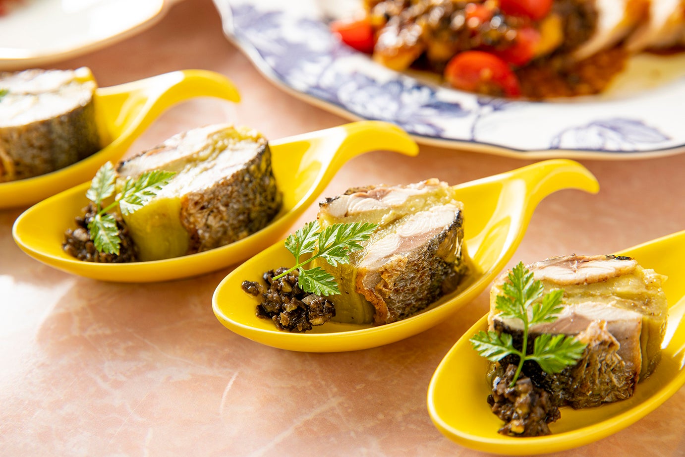 秋茄子を洋風の煮浸しにして、香ばしく焼いた秋刀魚を巻き、黒オリーブとアンチョビのソースで味わう一品。