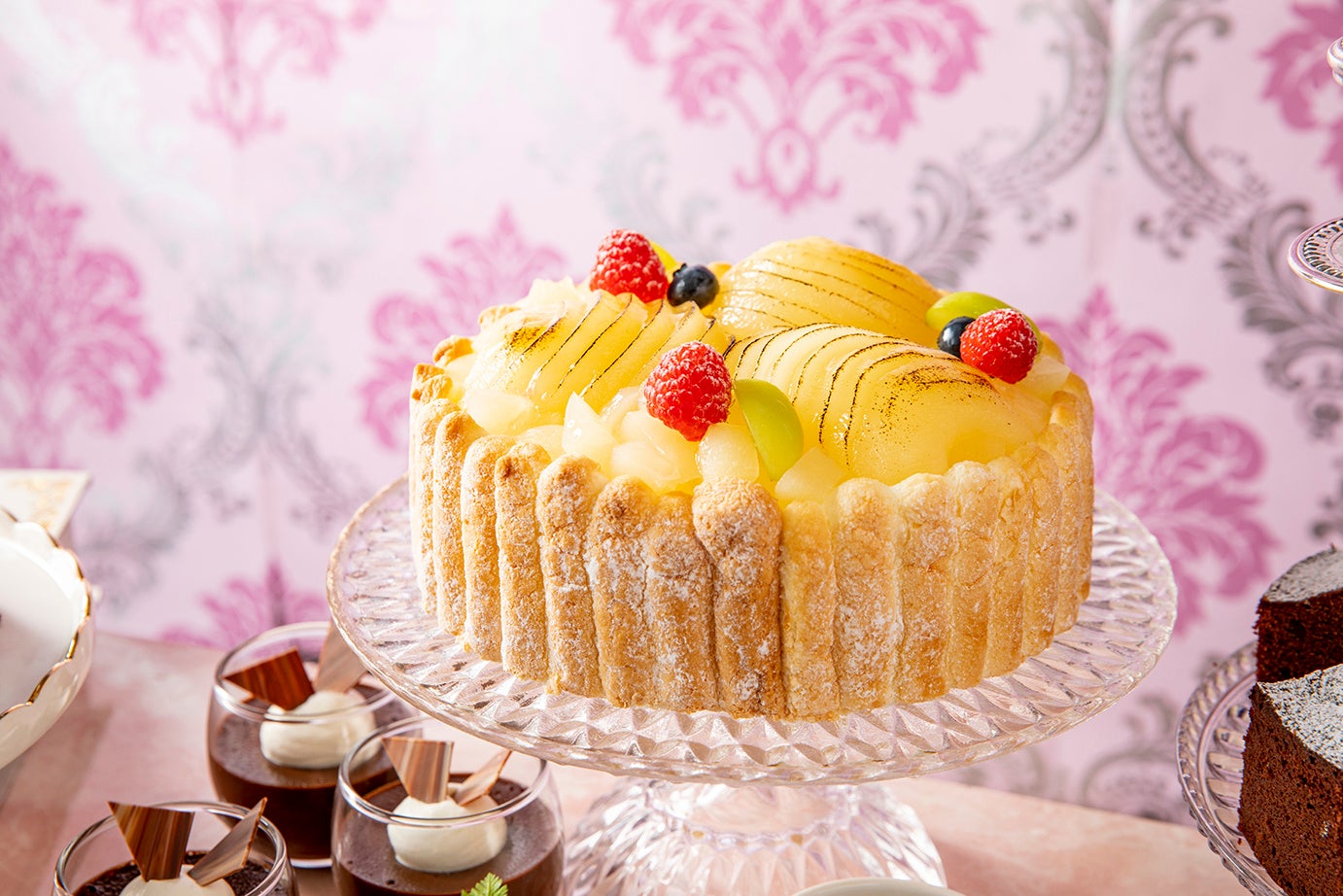 ババロアとムースを敷き詰め、まわりをしっとりふわふわのビスキュイで包まれたシャルロットケーキ。洋梨のコンポートをたっぷりとあしらった秋限定スイーツ。