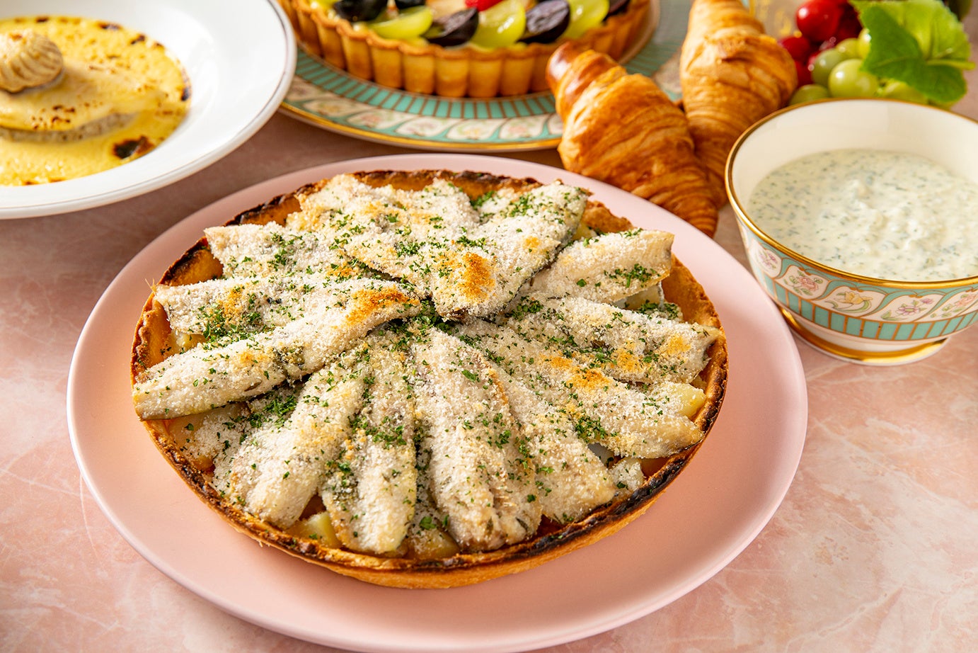 リヨネーズ風に仕上げたジャガイモをタルトに敷き詰め、その上に香草を加えコンフィにしたイワシを並べて焼き上げました。クリームチーズに香草を加えたソースで、魚の旨み、ジャガイモの甘味、香り、酸味のバランスを楽しむタルト。