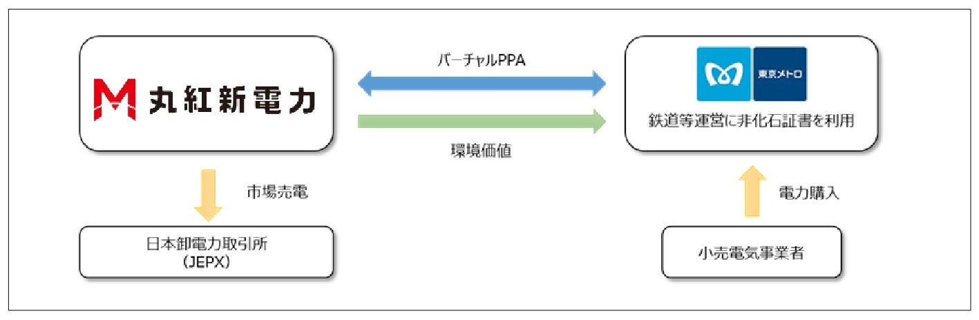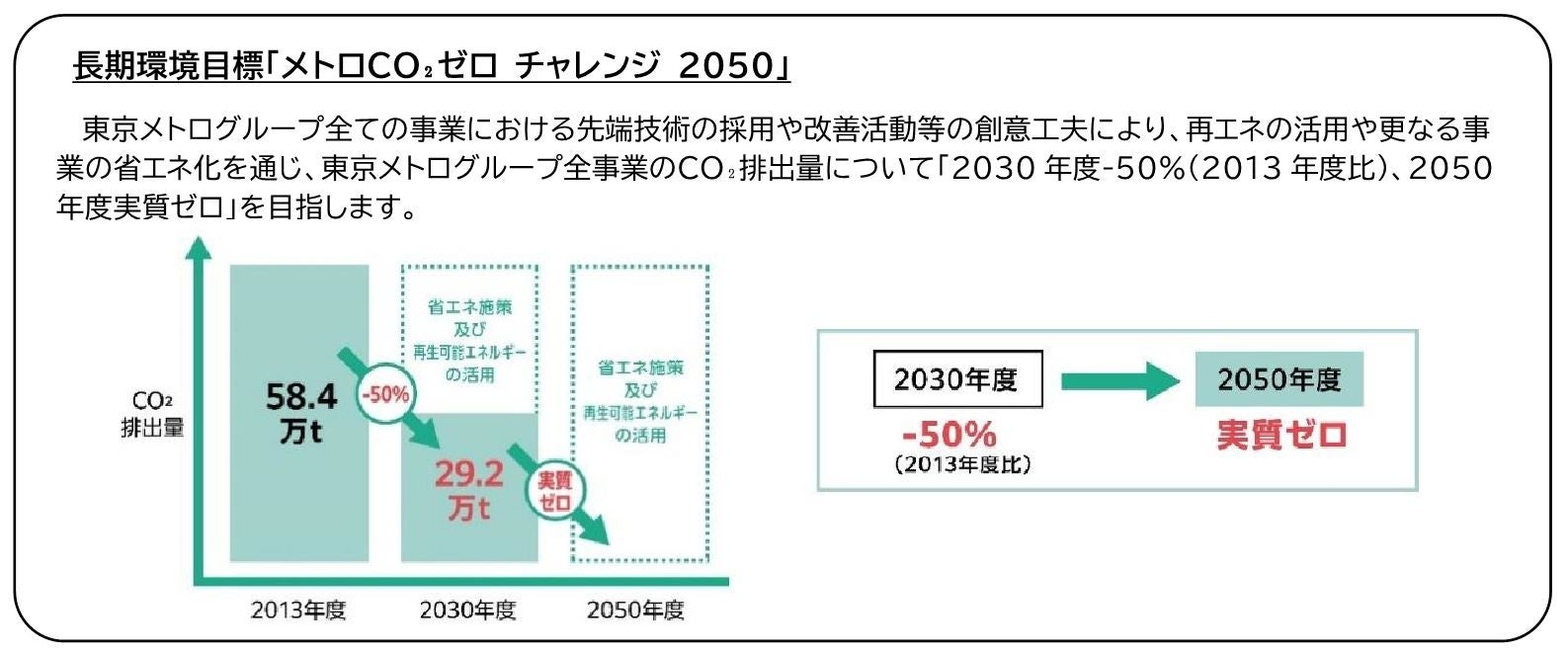 本契約の締結により、当社は複数の小水力発電所から約20年間にわたり、発電にともなって生み出される年間約3,500万kWh分の非化石証書(環境価値)の提供を受けます。これにより、東京メトロのCO₂排出量は、年間約13,650t-CO₂削減する見込みです。これは、東京メトログループの年間CO₂排出量のうち約4%に相当します。 東京メトロでは、2021年3月に長期環境目標「メトロCO₂ゼロ チャレンジ 2050」を設定し、東京メトログループ全事業が排出するCO₂量について、「2030年度-50%(2013年度比)、2050年度実質ゼロ」をめざしています。今後も目標達成に向け、バーチャルPPAをはじめとした多様な手段を用いて再生可能エネルギーの活用をさらに推進し、「安心で、持続可能な社会」の実現に貢献してまいります。詳細は別紙のとおりです。