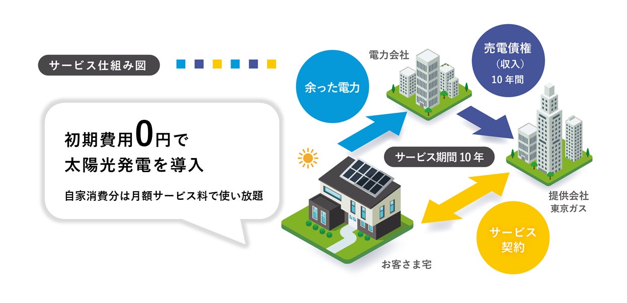 お客さま宅に初期費用0円で太陽光発電を導入し、サービス期間中は余剰電力の売電収入を東京ガスがいただくことで、割安な月額サービス料金にて太陽光発電をご利用いただけるサービスです。10年間のサービス期間終了後は売電収入も見込めます。詳細はこちら( https://home.tokyo-gas.co.jp/gas_power/plan/power/solar.html )。