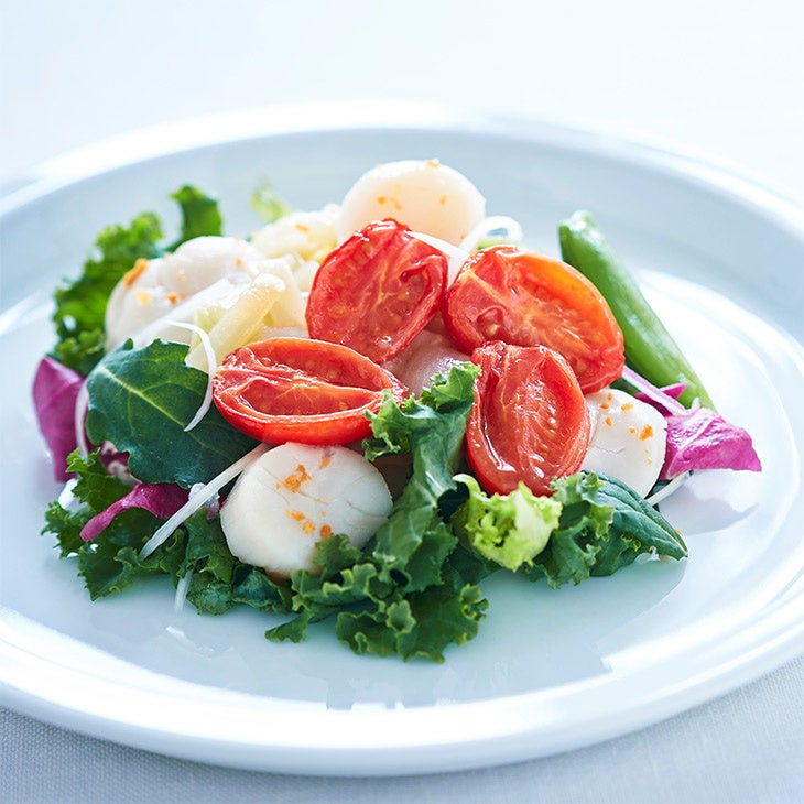 果肉が厚く甘みのあるアイコをセミドライで使用。ガーリックの香りとバターのコク、あさりのうまみをきかせた魚介ソースが、帆立やアイコのうまみと好相性。