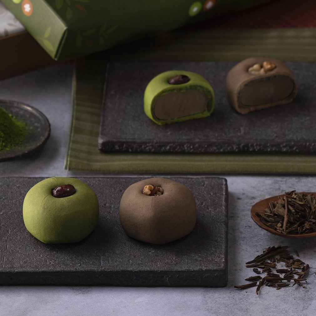 京都産抹茶の抹茶餡と柔らかな求肥をもちもち生地で包みました。