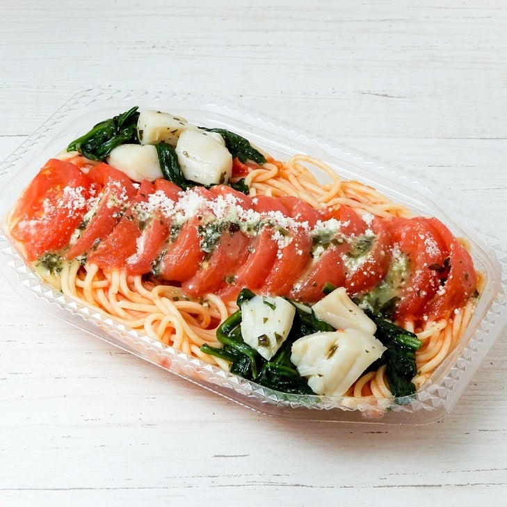 焼きトマトとバジル風味のほうれん草と帆立貝柱の冷製パスタ。