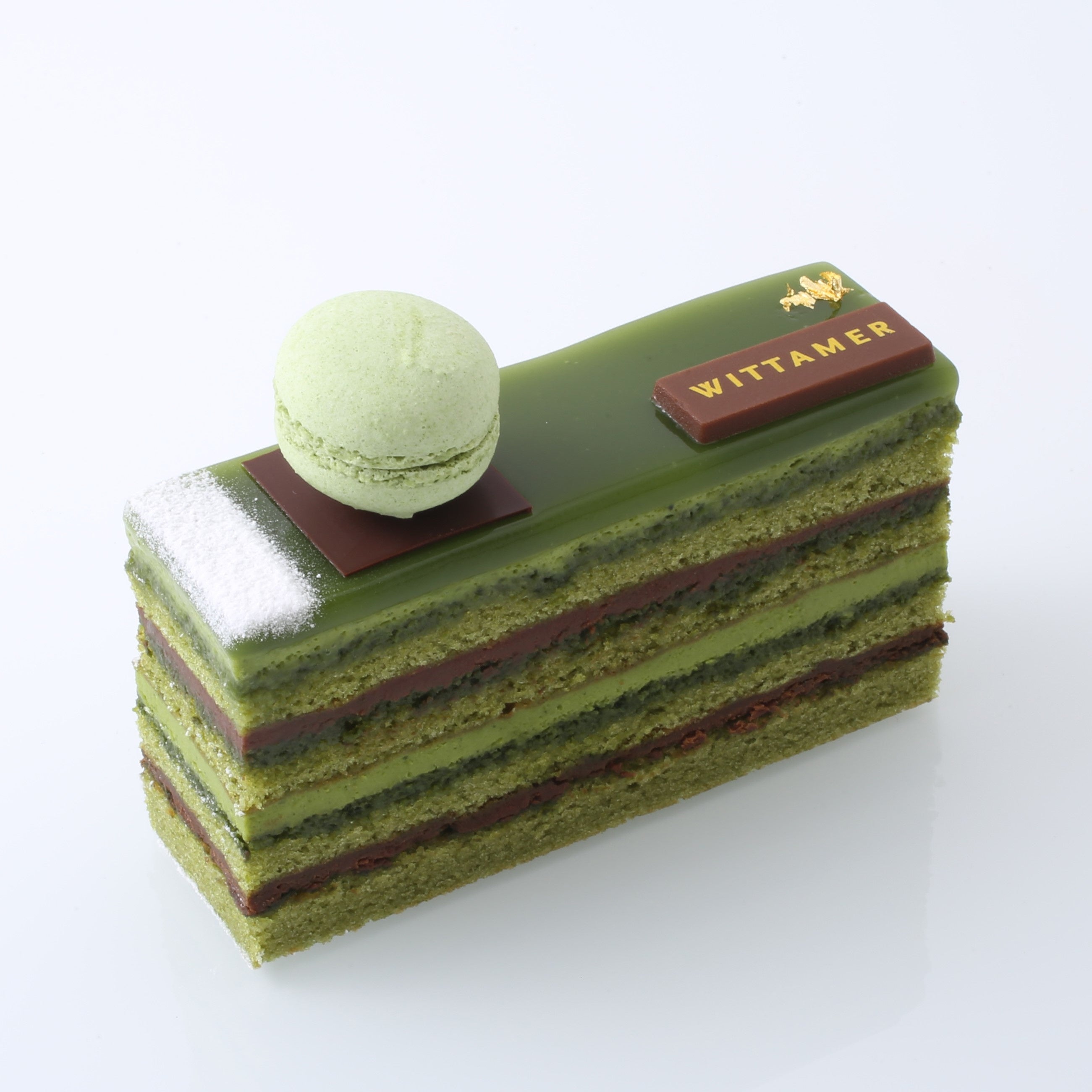 ほろ苦い抹茶のホワイトチョコレートや抹茶バタークリームなどを重ねた8層のオペラ。オレンジのアクセントをきかせて。