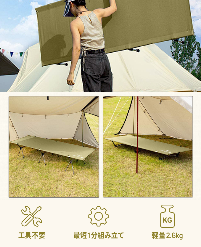 持ち運び時55㎝、重さ2.6kgの持ち運び安さと、工具不要の1分組み立ての『Game Bed』で時には家族とのキャンプで、時には大好きな仲間とのBBQなどのお供としてお楽しみください。