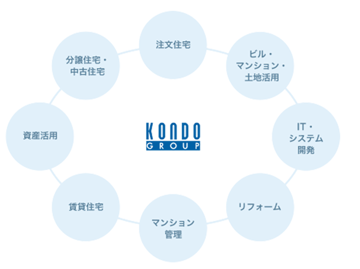 KONDOグループは「埼玉県」という地域に密着し、住まい・土地に関することを、施工、不動産、リフォーム、メンテナンス、さまざまな視点からトータルサポートを行うグループ企業です。「親戚づきあい」を合言葉に、各分野のプロがお客さまのご要望を把握して、想いを形に致します。近藤建設はKONDOグループの中のひとつで、注文住宅・総合建設事業・土地活用を担っております。